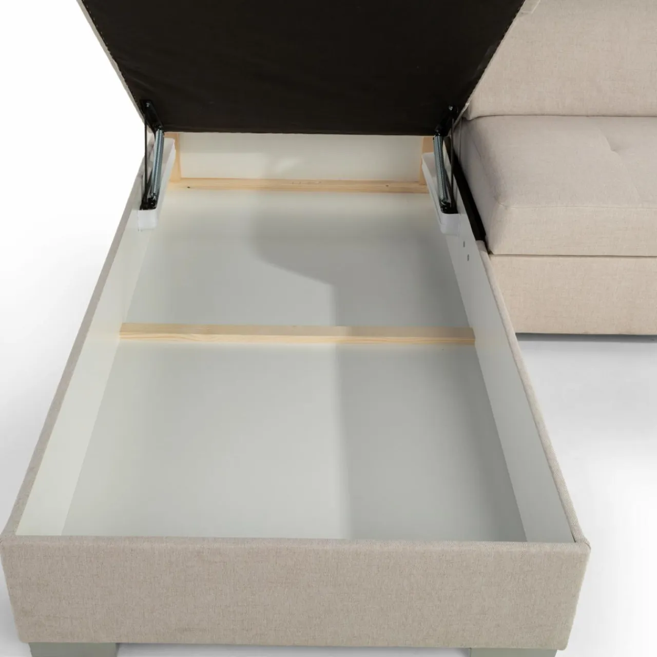 - Pojemnik w leżance da Ci przestrzeń na pościel i inne domowe tekstylia. Możesz z niego korzystać nawet po rozłożeniu narożnika.