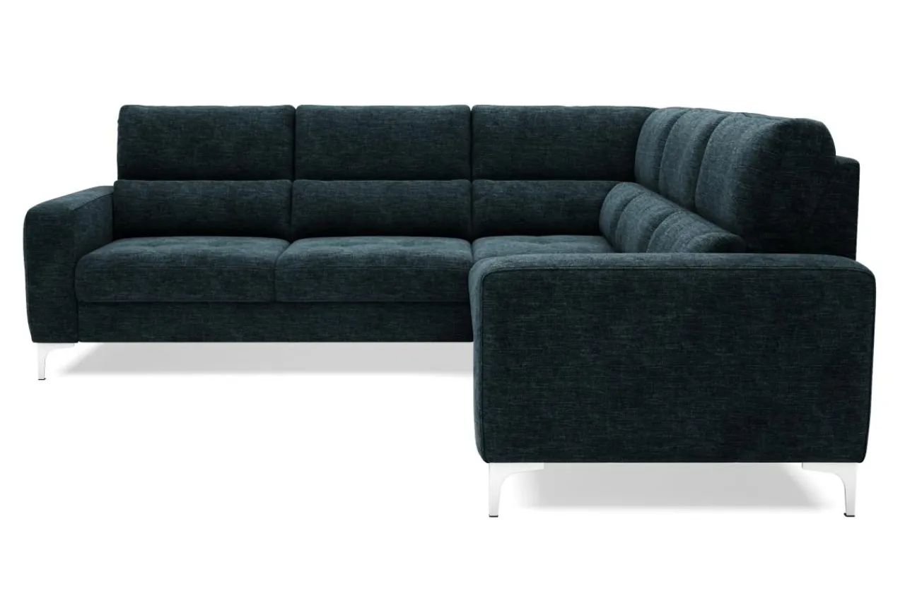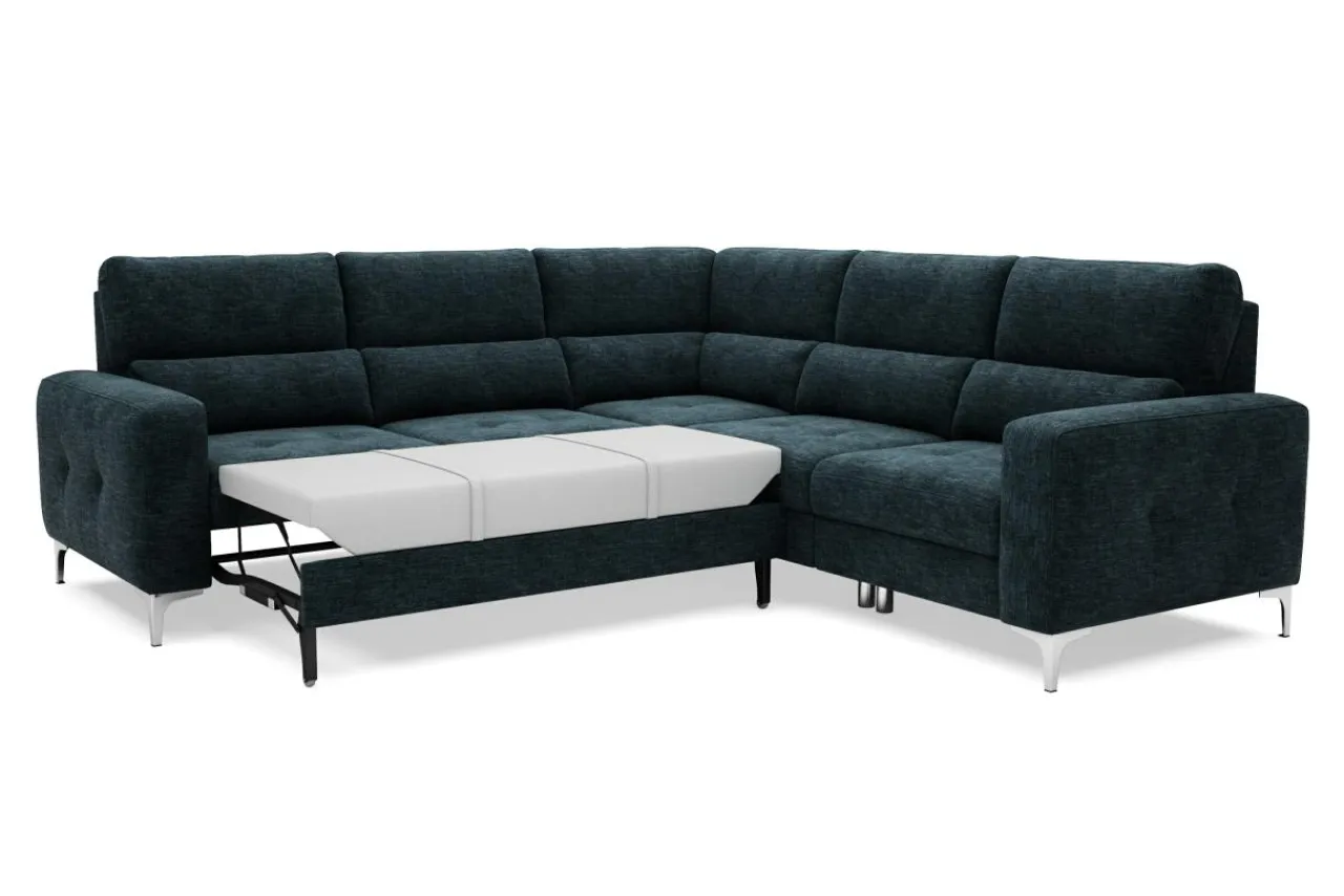 Dzięki zastosowaniu mechanizmu typu delfin, możesz przekształcić narożnik w łóżko do okazjonalnego spania, bez konieczności odsuwania go od ściany. Poszewki i koce możesz schować do szuflady, znajdującej się pod jednym z foteli.