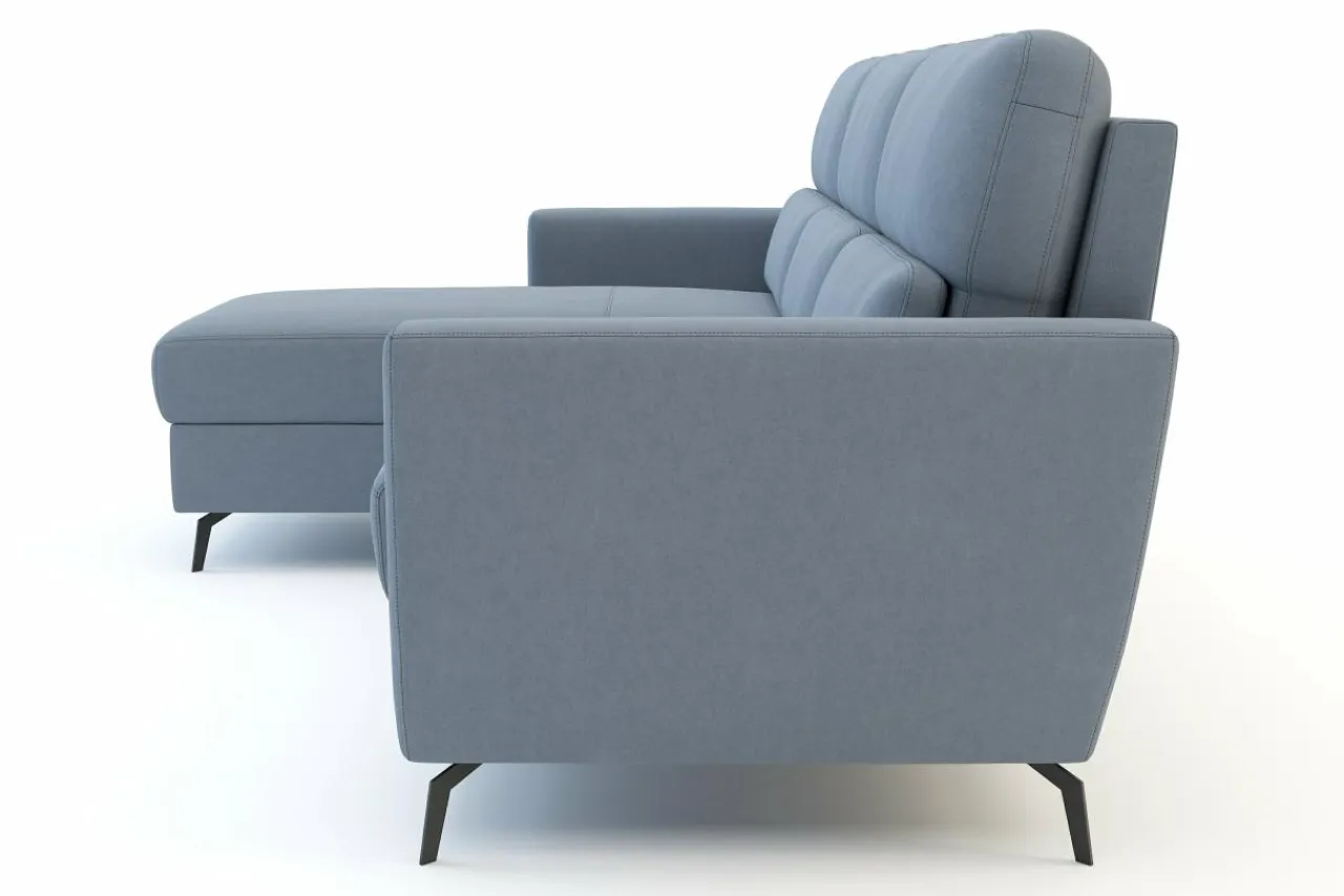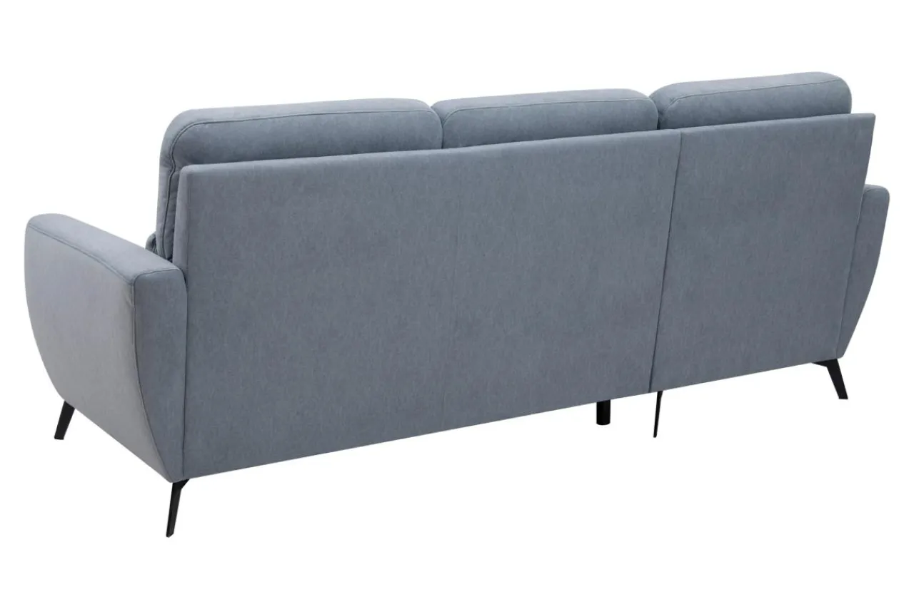 Narożnik osadzony jest na ukośnych metalowych nóżkach. Obity jest szaroniebieską tkaniną, która z daleka wygląda jak skóra. Jest przyjemna w dotyku, w niejednolitej barwie.
