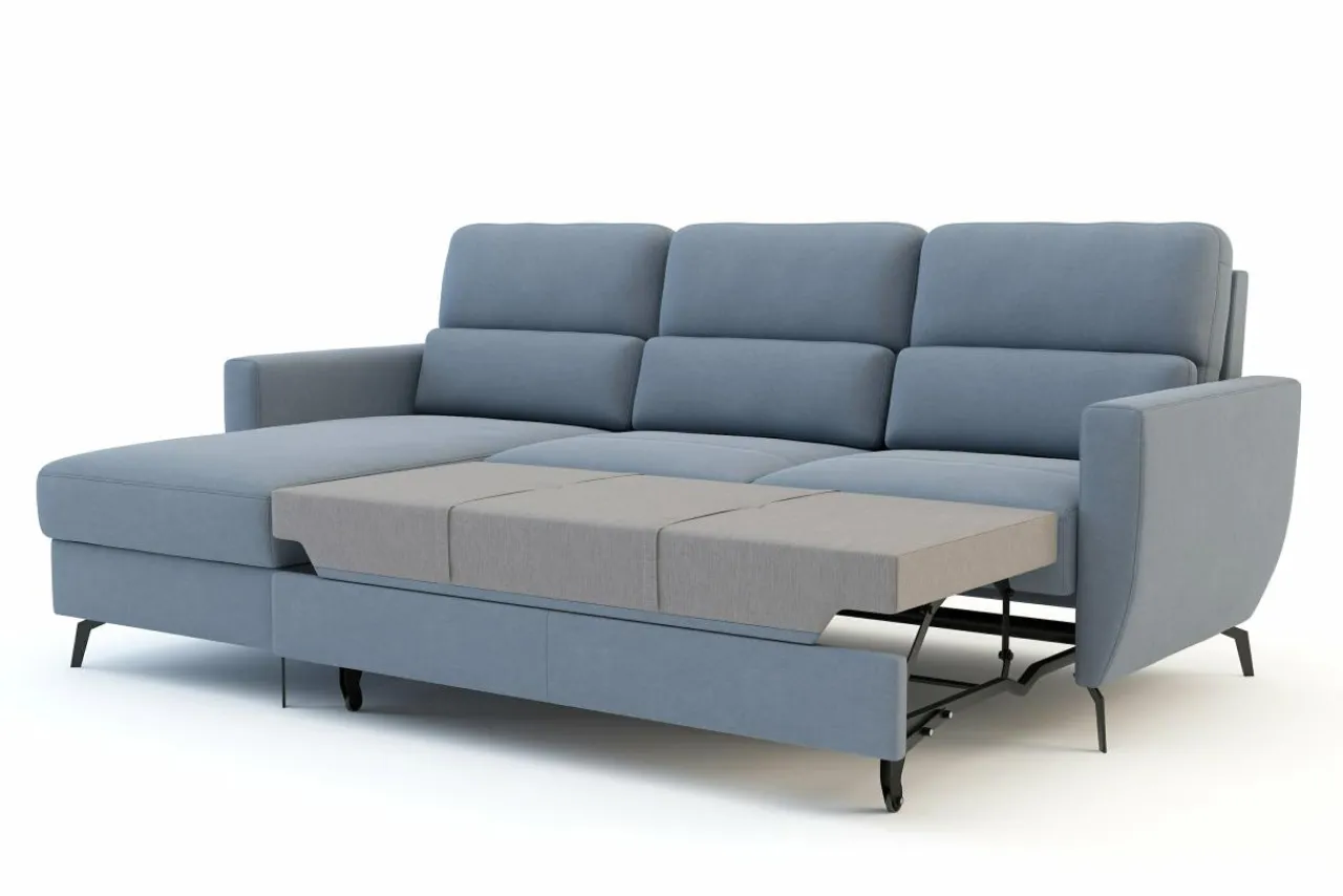 Narożnik rozkłada się za pomocą systemu typu delfin. Wystarczy, że wysuniesz wmontowaną w siedzisko szufladę i podniesiesz do góry dodatkowy element.