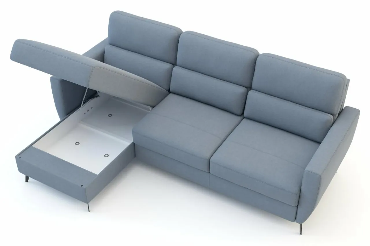 W leżance znajdziesz wbudowany pojemnik. Możesz go wykorzystać do przechowywania pościeli, koców lub innych tekstyliów.