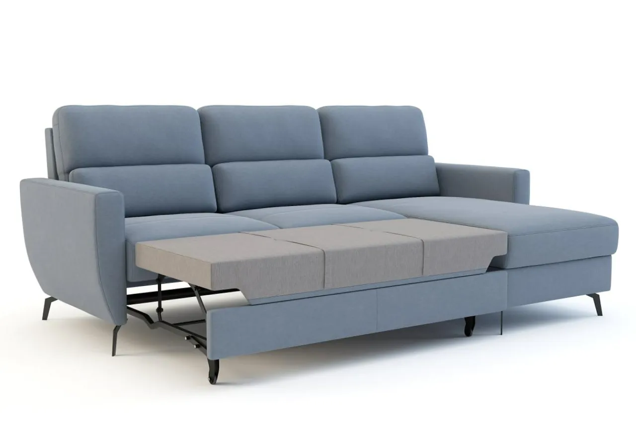 Narożnik rozkłada się za pomocą systemu typu delfin. Wystarczy, że wysuniesz wmontowaną w siedzisko szufladę i podniesiesz dodatkowy element.