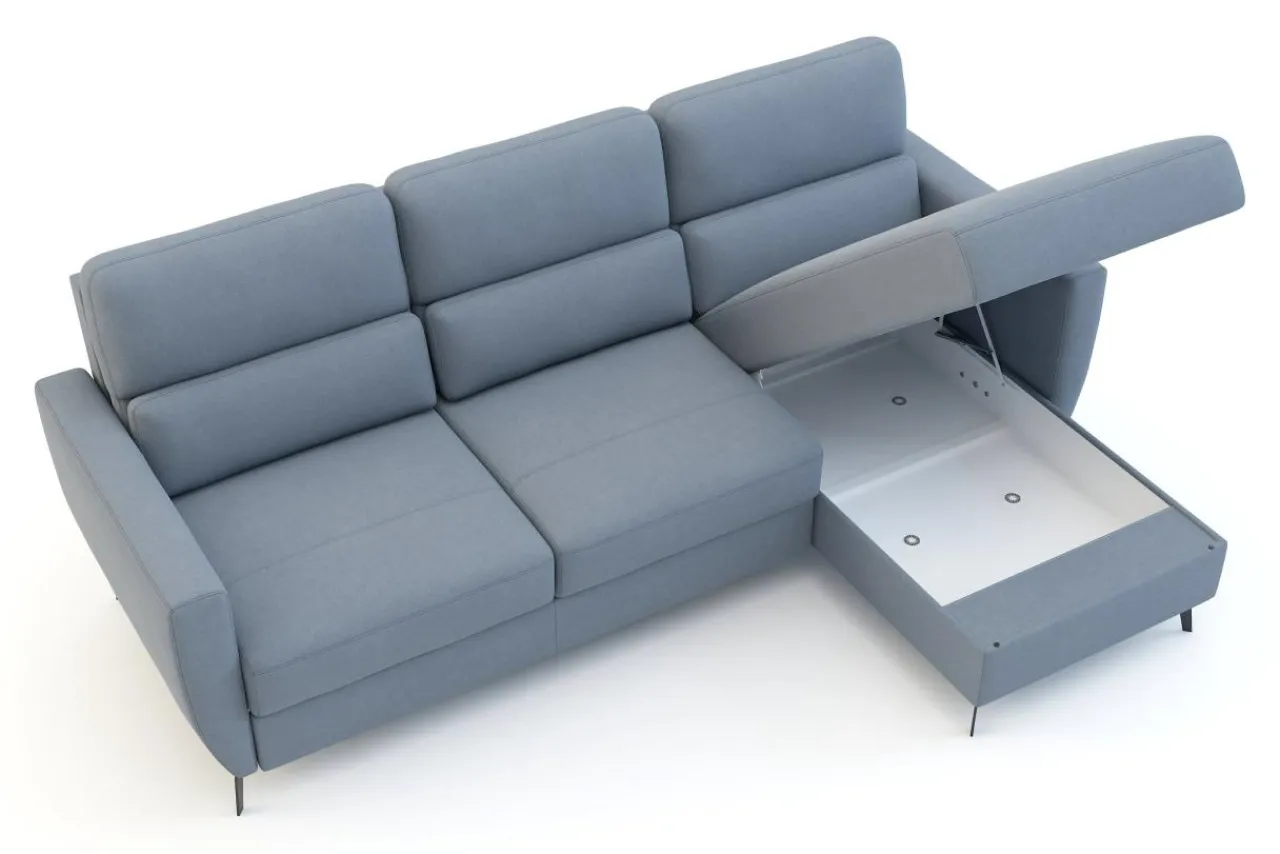 W leżance znajdziesz wbudowany pojemnik. Możesz go wykorzystać do przechowywania pościeli, koców lub innych tekstyliów.