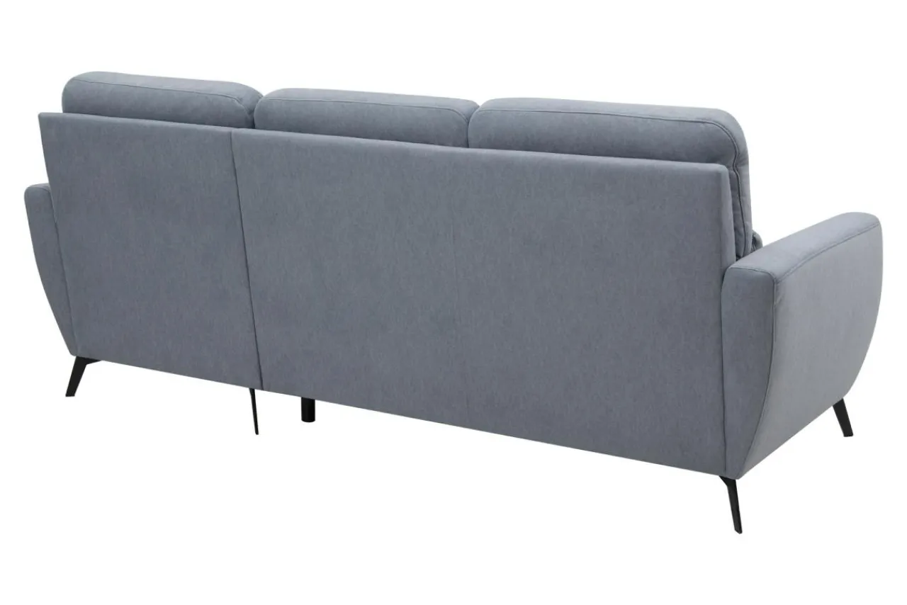 Narożnik osadzony jest na ukośnych metalowych nóżkach. Obity jest szaroniebieską tkaniną, która z daleka wygląda jak skóra. Jest przyjemna w dotyku, w niejednolitej barwie.