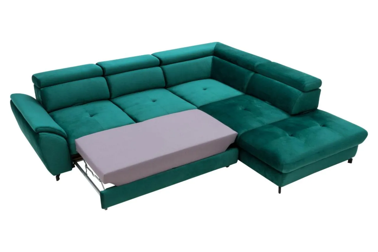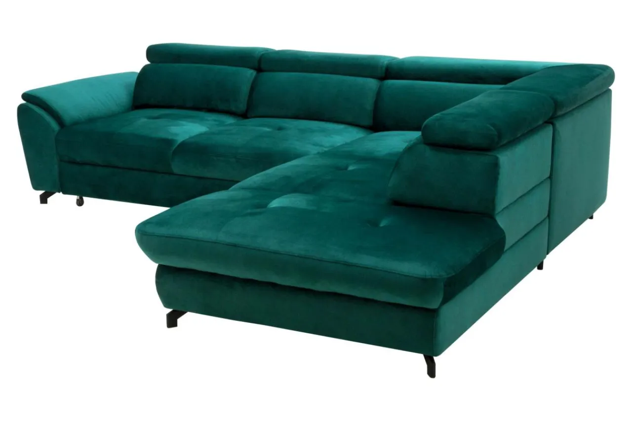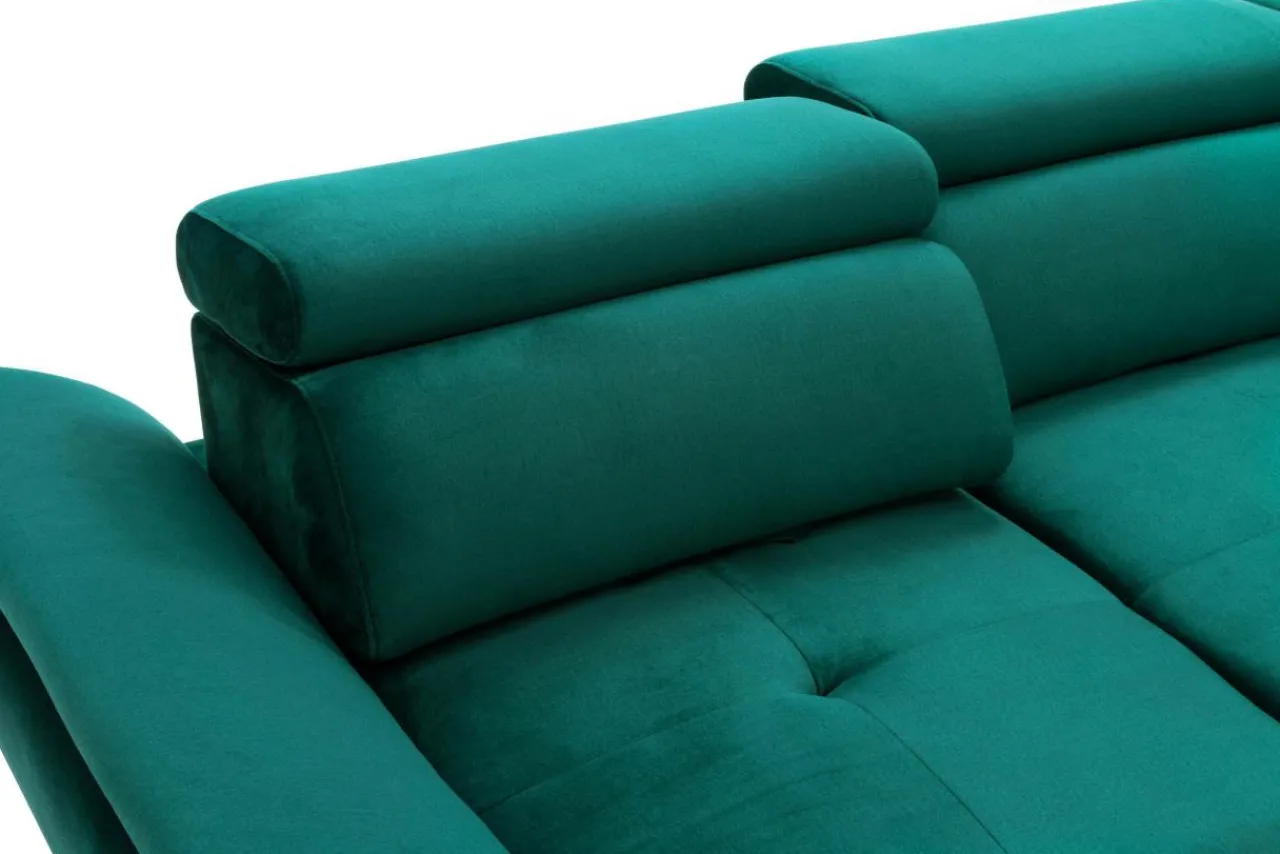 Narożnik ustawiono na eleganckich nóżkach wykonanych z metalu i malowanych na czarno. Świetnie wyglądają na tle szmaragdowego koloru tkaniny. Tkanina MONOLITH to ma wysoki współczynnik odporności na ścieranie, pokryta jest hyrdrofobową powłoką WATER REPELLENT. Zabezpiecza ona tkaninę przed natychmiastowym wsiąkaniem rozlanych płynów do jej wnętrza dając nam więcej czasu na odsączenie plamy.