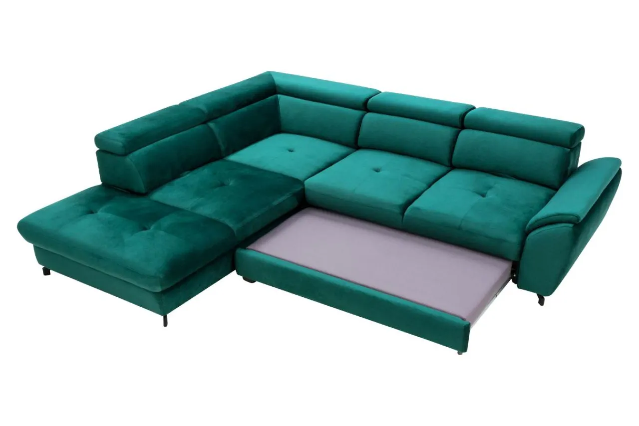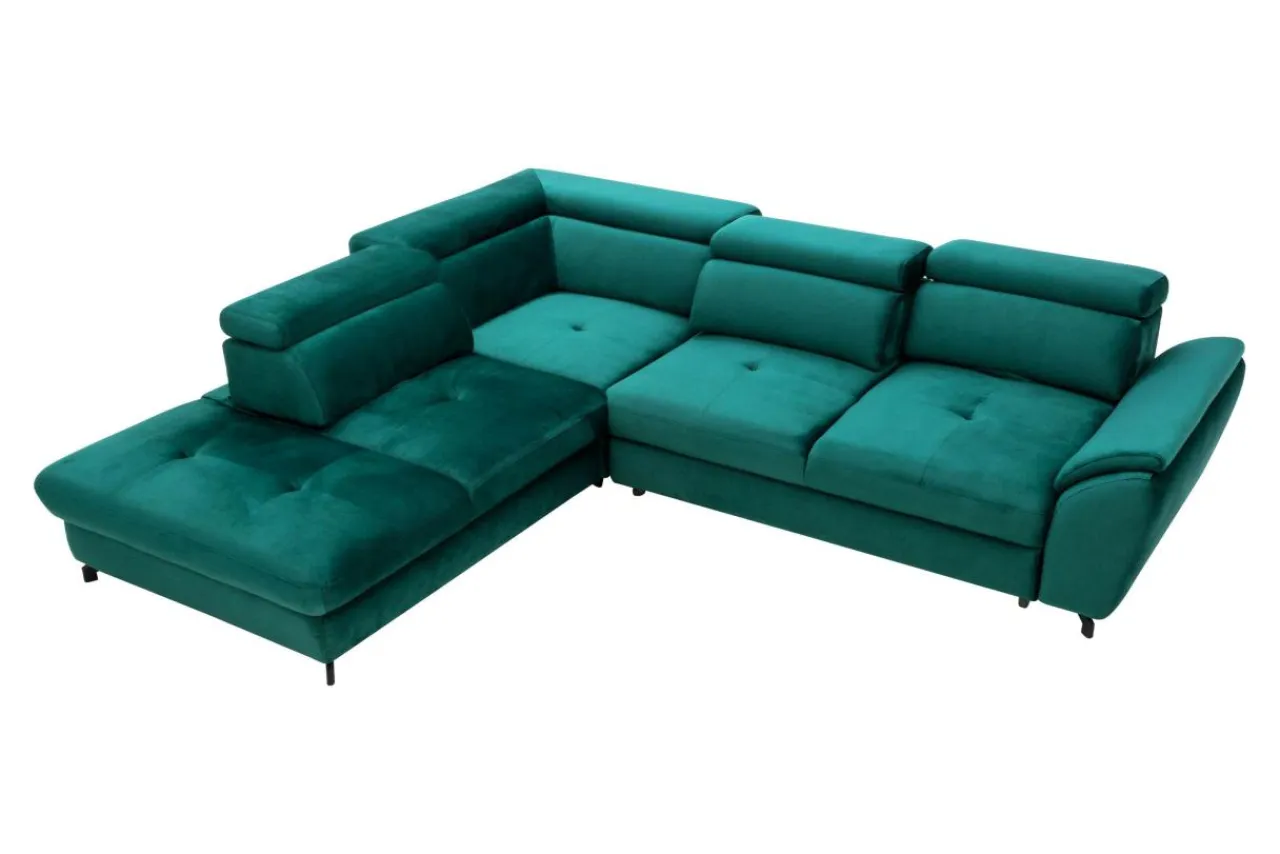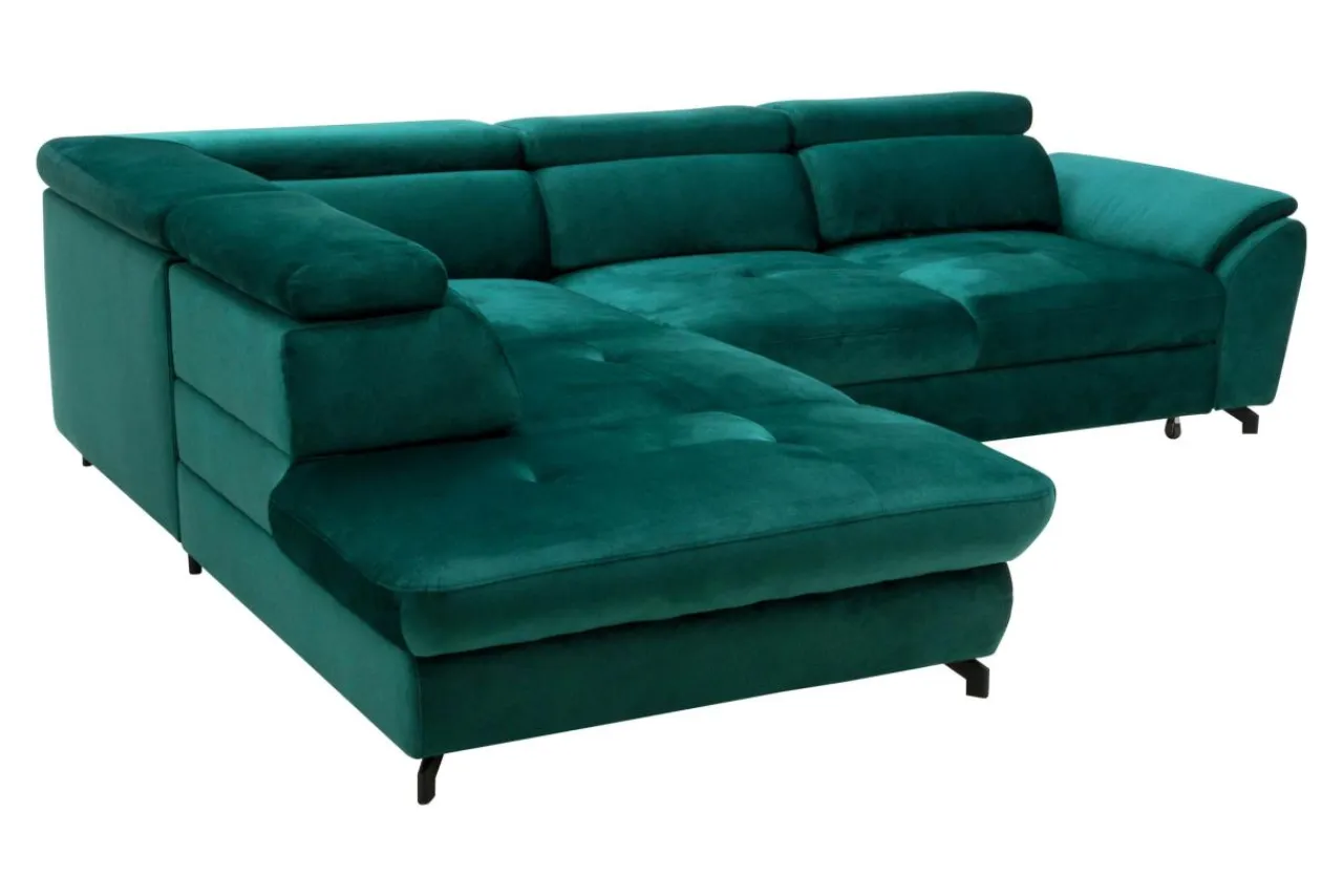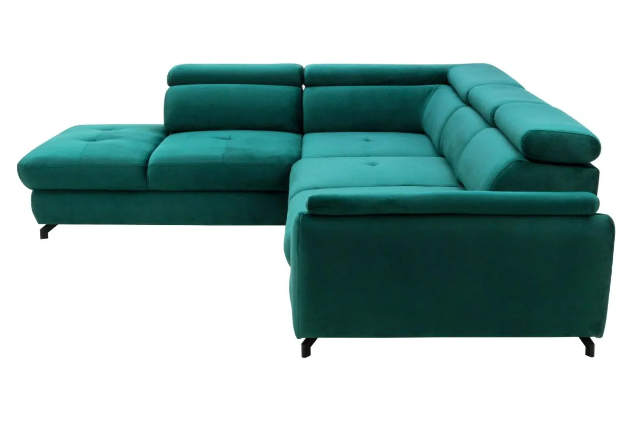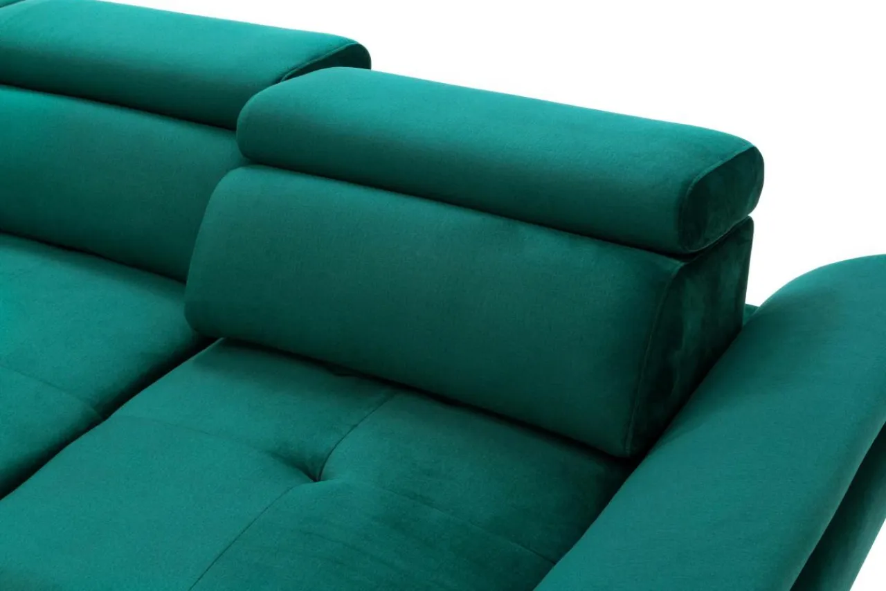 Narożnik ustawiono na eleganckich nóżkach wykonanych z metalu i malowanych na czarno. Świetnie wyglądają na tle szmaragdowego koloru tkaniny. Tkanina MONOLITH to ma wysoki współczynnik odporności na ścieranie, pokryta jest hyrdrofobową powłoką WATER REPELLENT. Zabezpiecza ona tkaninę przed natychmiastowym wsiąkaniem rozlanych płynów do jej wnętrza dając nam więcej czasu na odsączenie plamy.