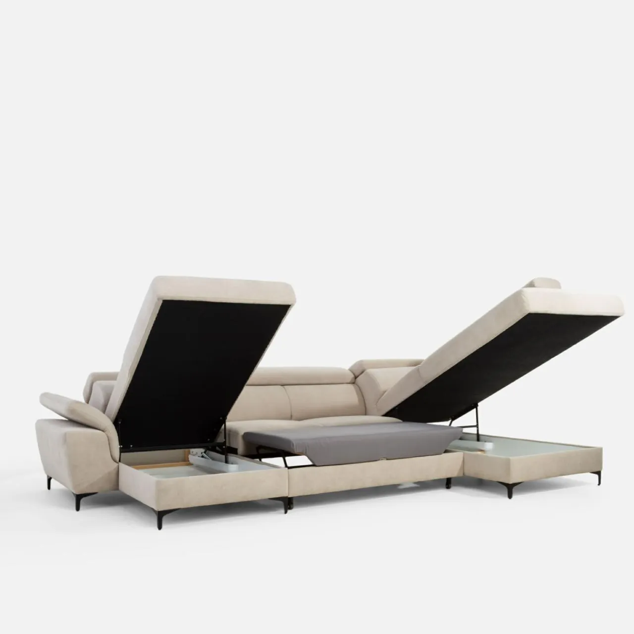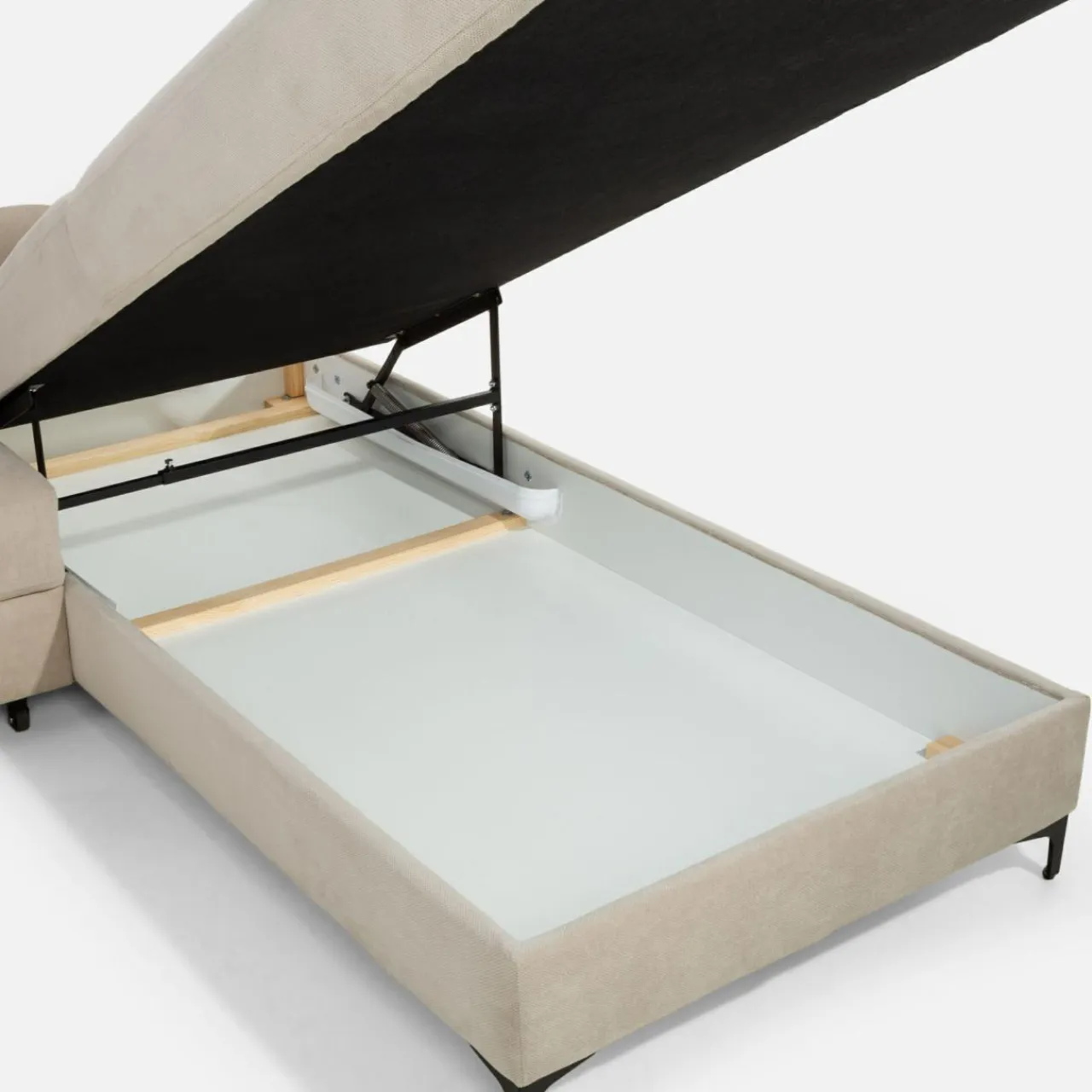 Stelaż pod siedziskiem wysuwamy i podnosimy za pomocą uchwytu. Mebel nie wymaga odsuwania od ściany. Idealny do okazjonalnego spania.