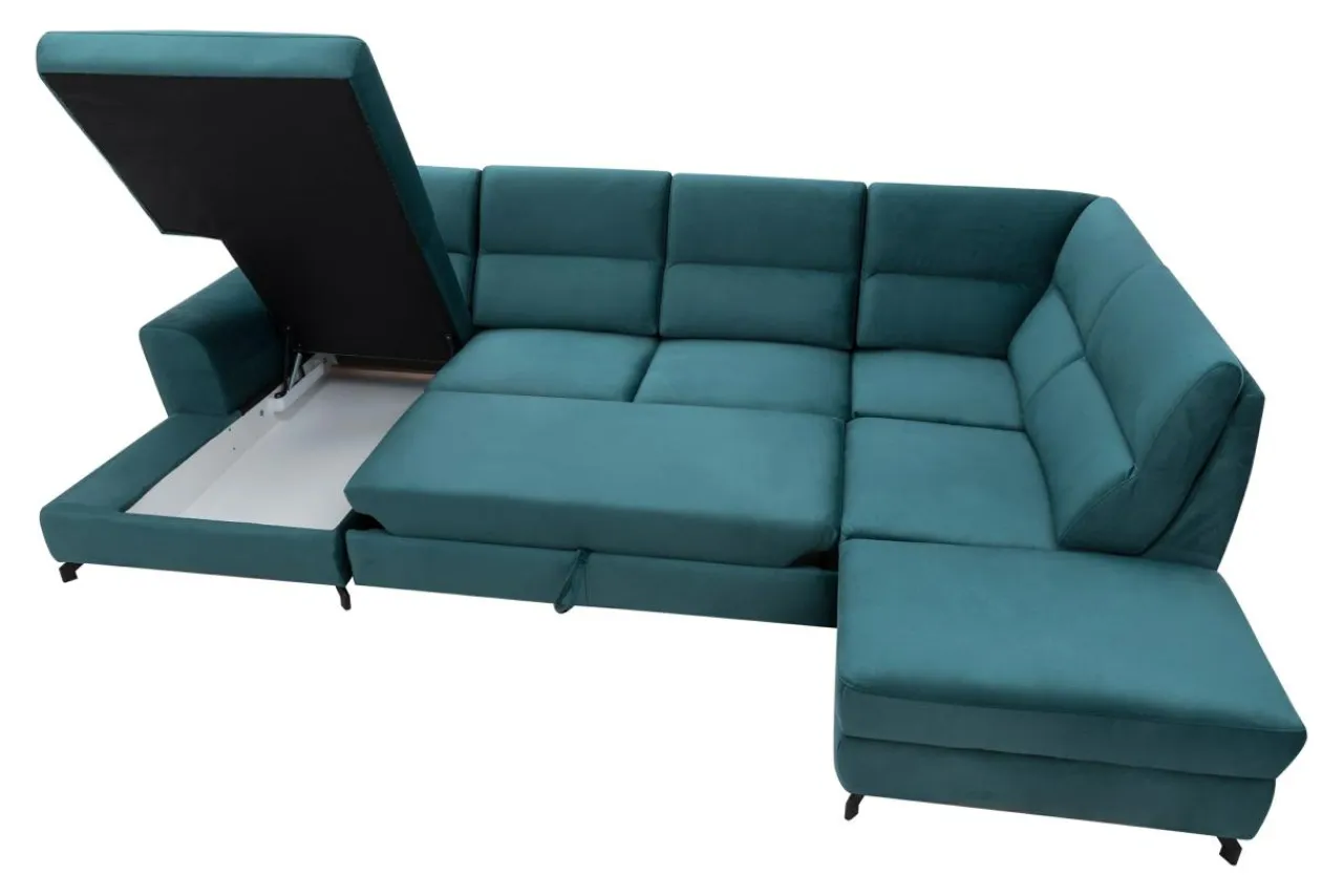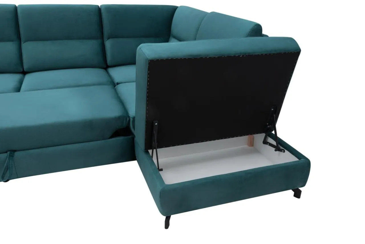 - Narożnik jest wyposażony w 2 pojemniki na pościel. Pomieścisz w nich nie tylko dodatkowe posłanie, ale też koce czy inne tekstylia domowe.
