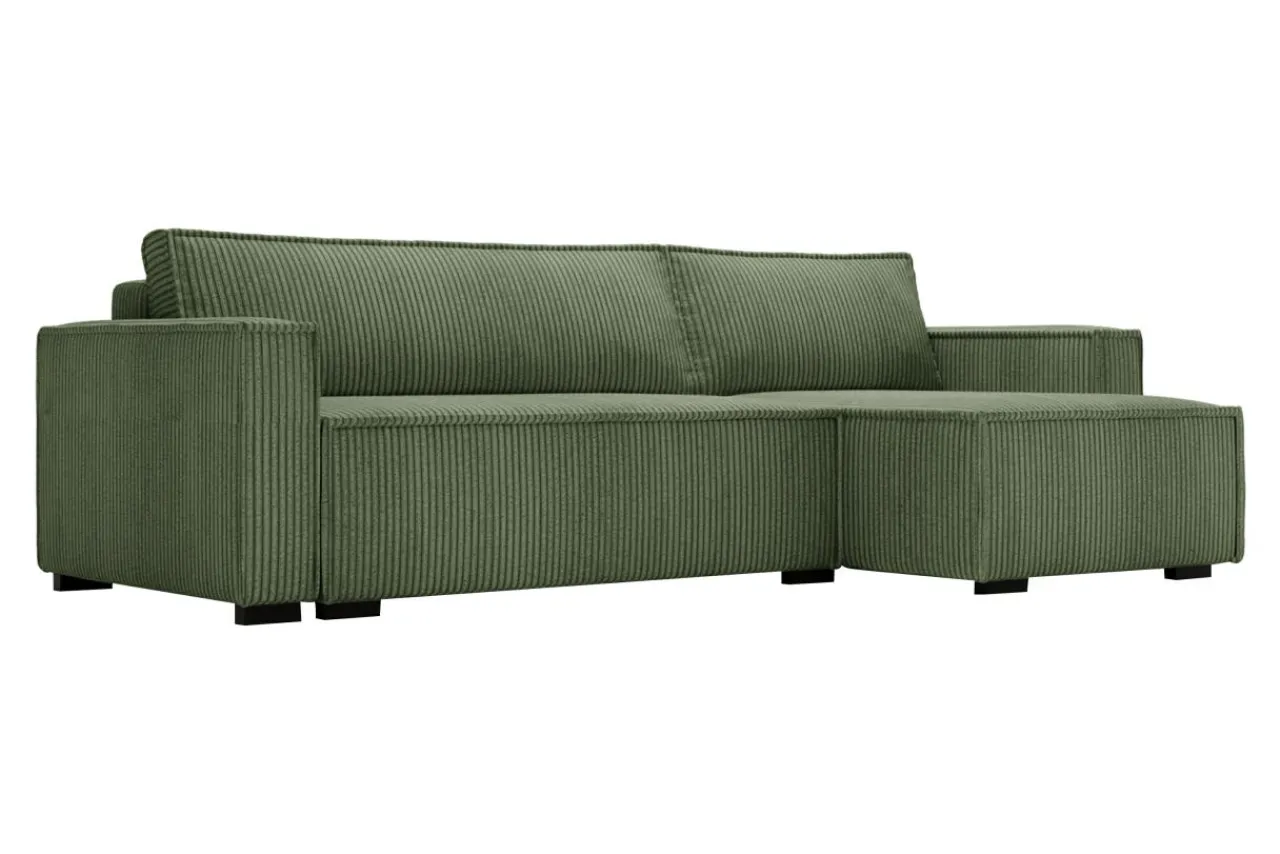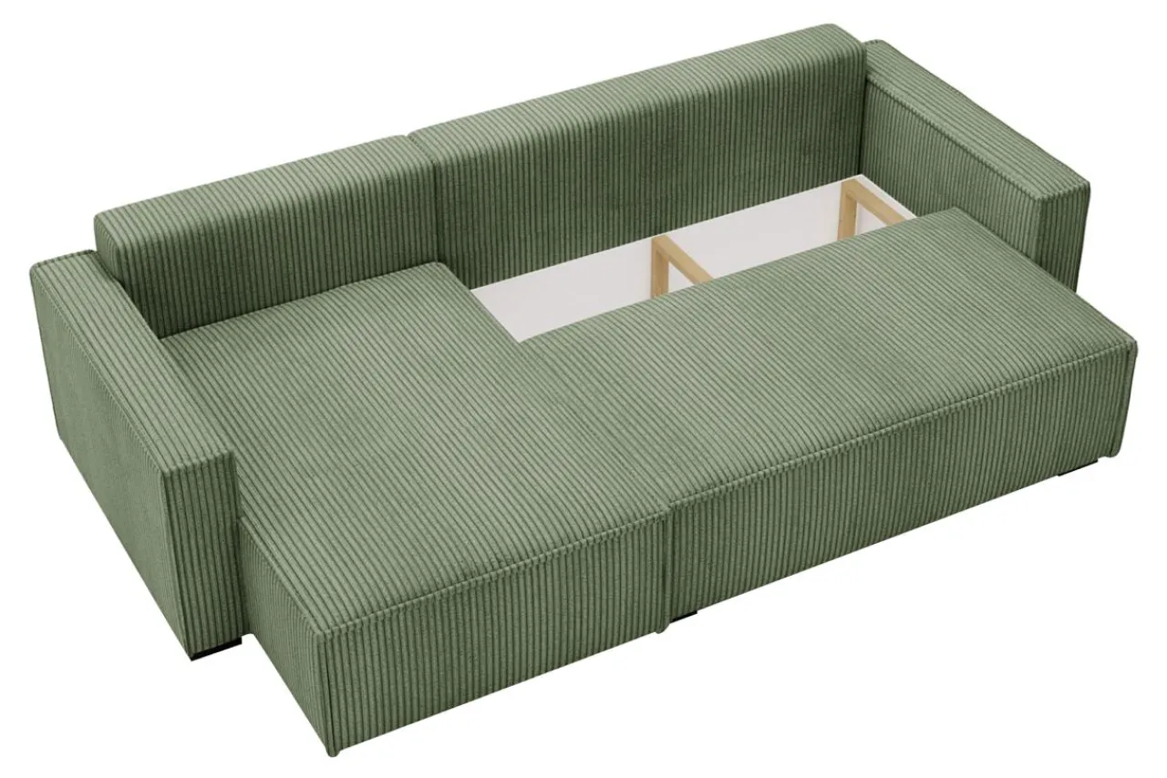Lubisz zielone akcenty we wnętrzach? Narożnik GROVER pokryty jest przyjemnym w dotyku sztruksem w oliwkowym kolorze, który dopasujesz do białych ścian i mebli z jasnego drewna.