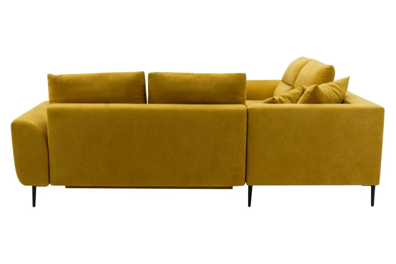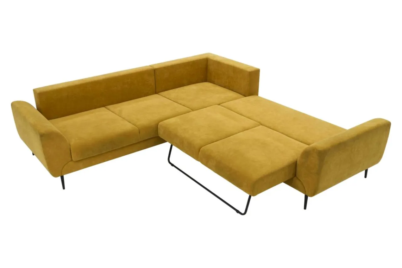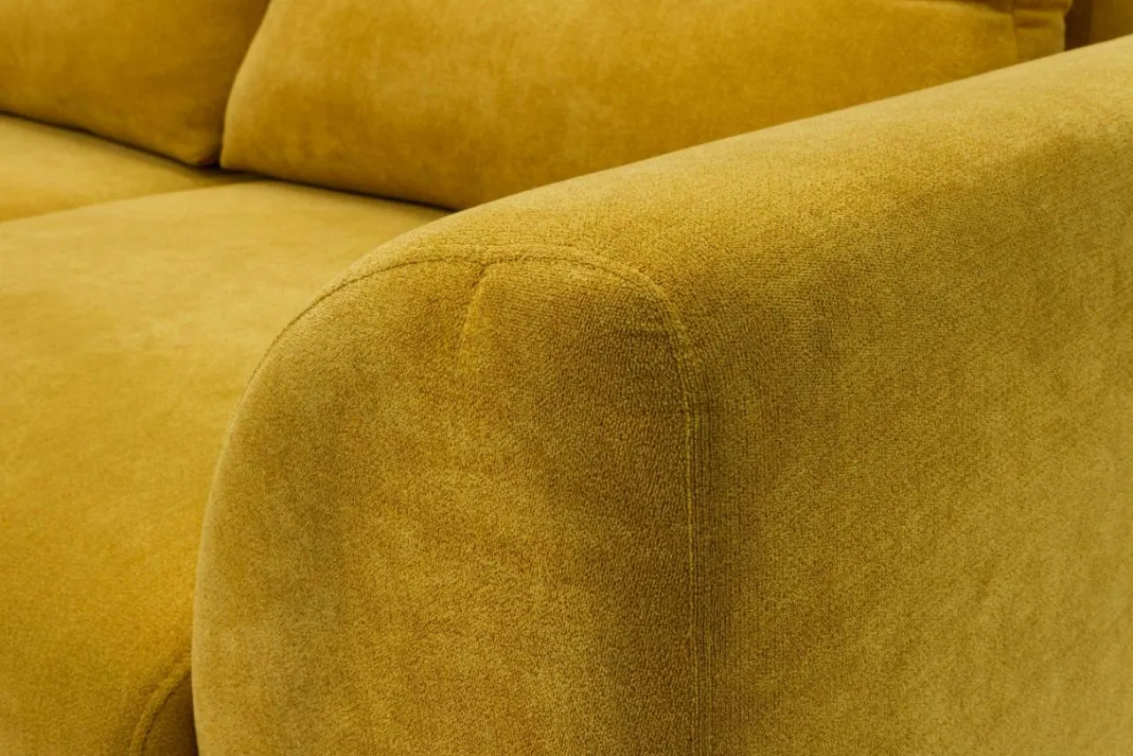 Mebel ustawiono na wysokich nóżkach w ciemnym kolorze, które ułatwiają sprzątanie pod meblem i tworzą kontrast z żywym kolorem tkaniny.