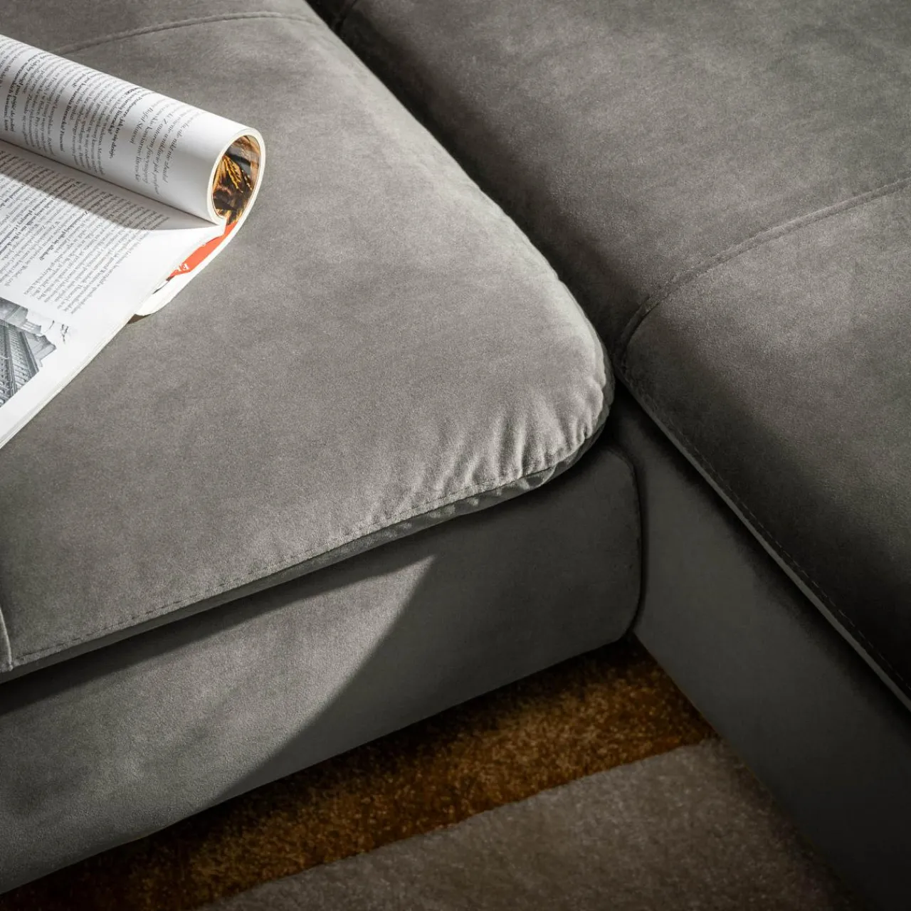 Na siedząco czy na leżąco? Wypoczywaj na narożniku VESPA w sposób, który Ci odpowiada. Aksamitny w dotyku welur umili popołudniowy relaks – aż trudno się oprzeć!
