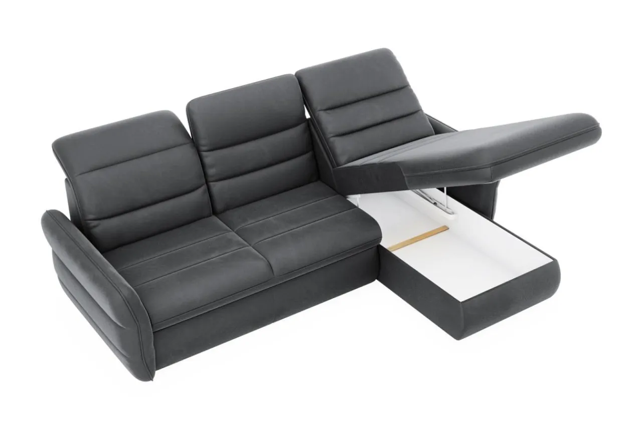 Komplet pościeli, koce i poduszki mozna umieścić w pojemnym schowku, który znajduje się pod siedziskiem narożnika w otomanie.