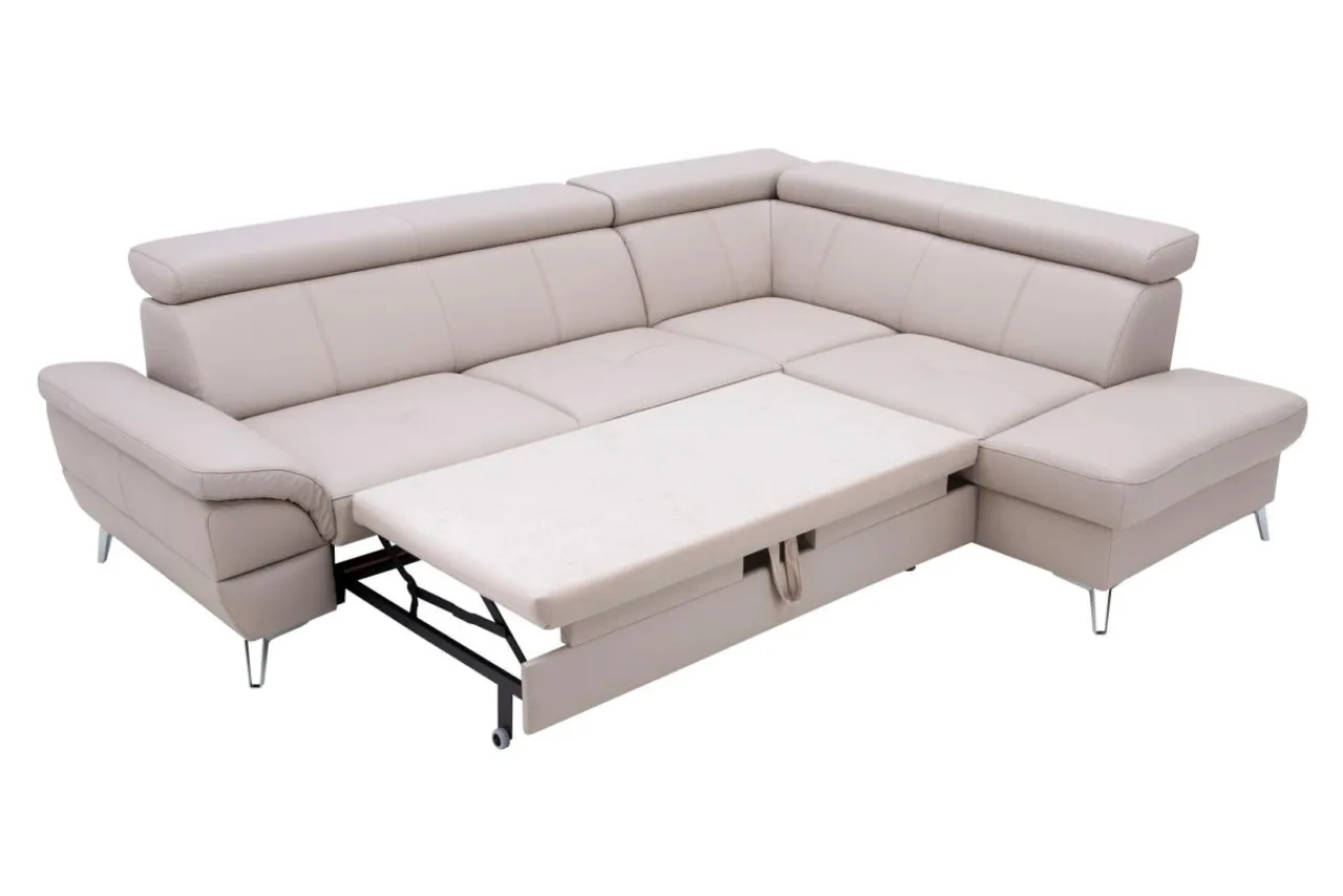 Narożnik posiada system rozkładania typu delfin. Dzięki niemu w prosty sposób uzyskasz dodatkową przestrzeń, którą w razie potrzeby możesz wykorzystać do spania.
