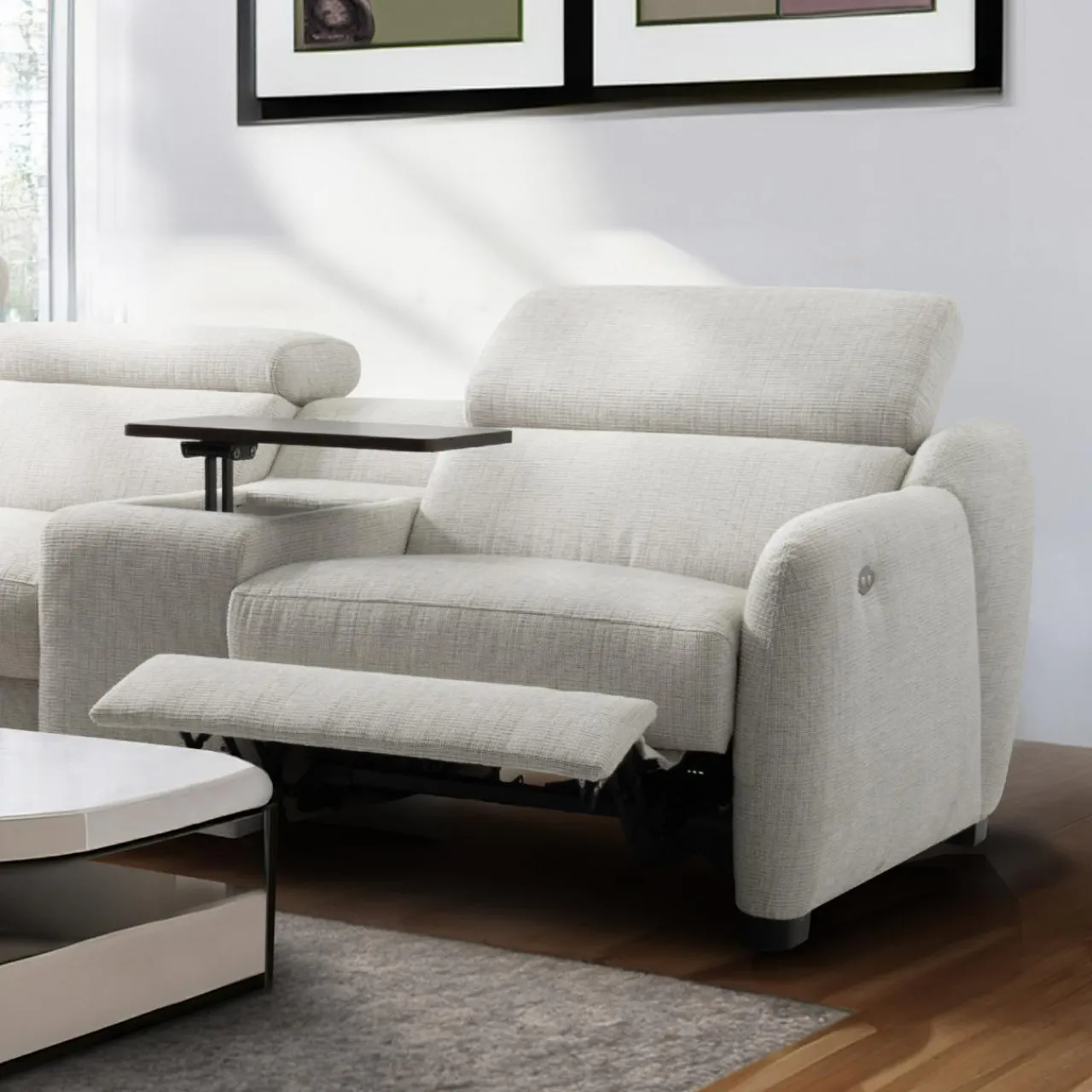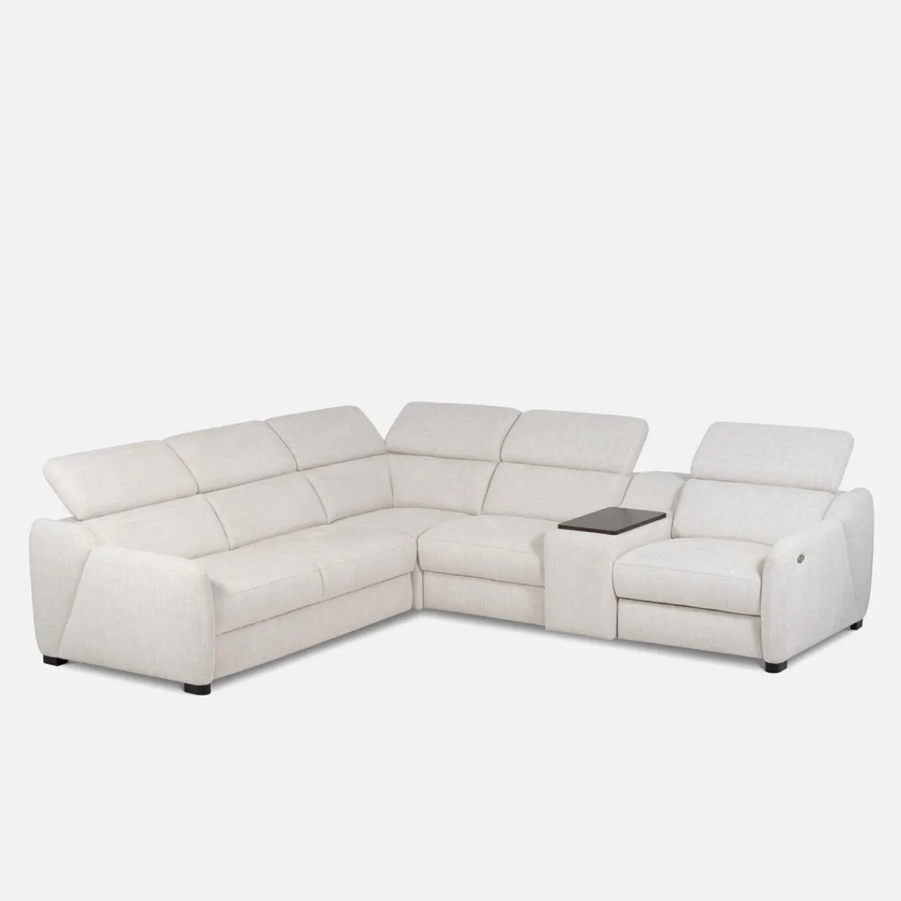 - Narożnik wyposażony jest w fotel z elektryczną funkcją relaks, która pozwala rozsiąść się wygodnie w pozycji półleżącej — idealnej do oglądania filmów, czytania książek lub po prostu relaksu.