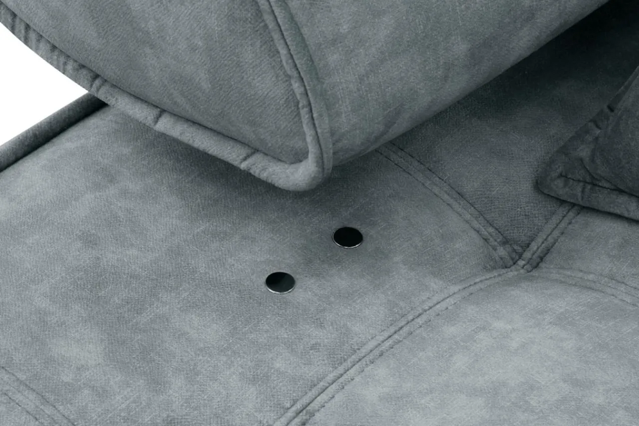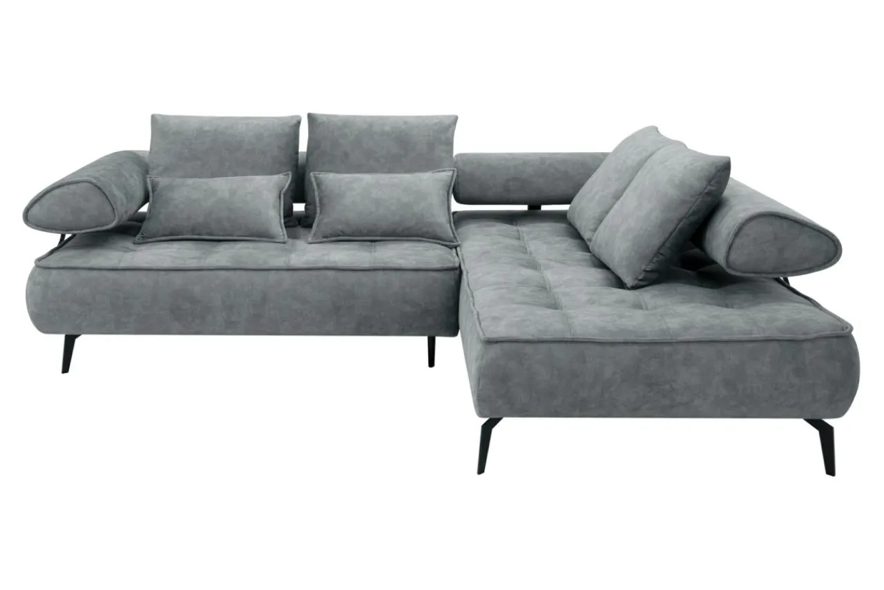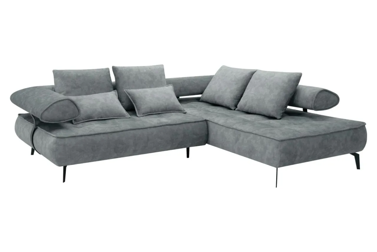 SELEDO L jest utrzymany w chłodnej tonacji, którą podkreśla połączenie szarej tapicerki w metalicznym odcieniu oraz czarnych, matowych nóżek i wsporników przy oparciu.