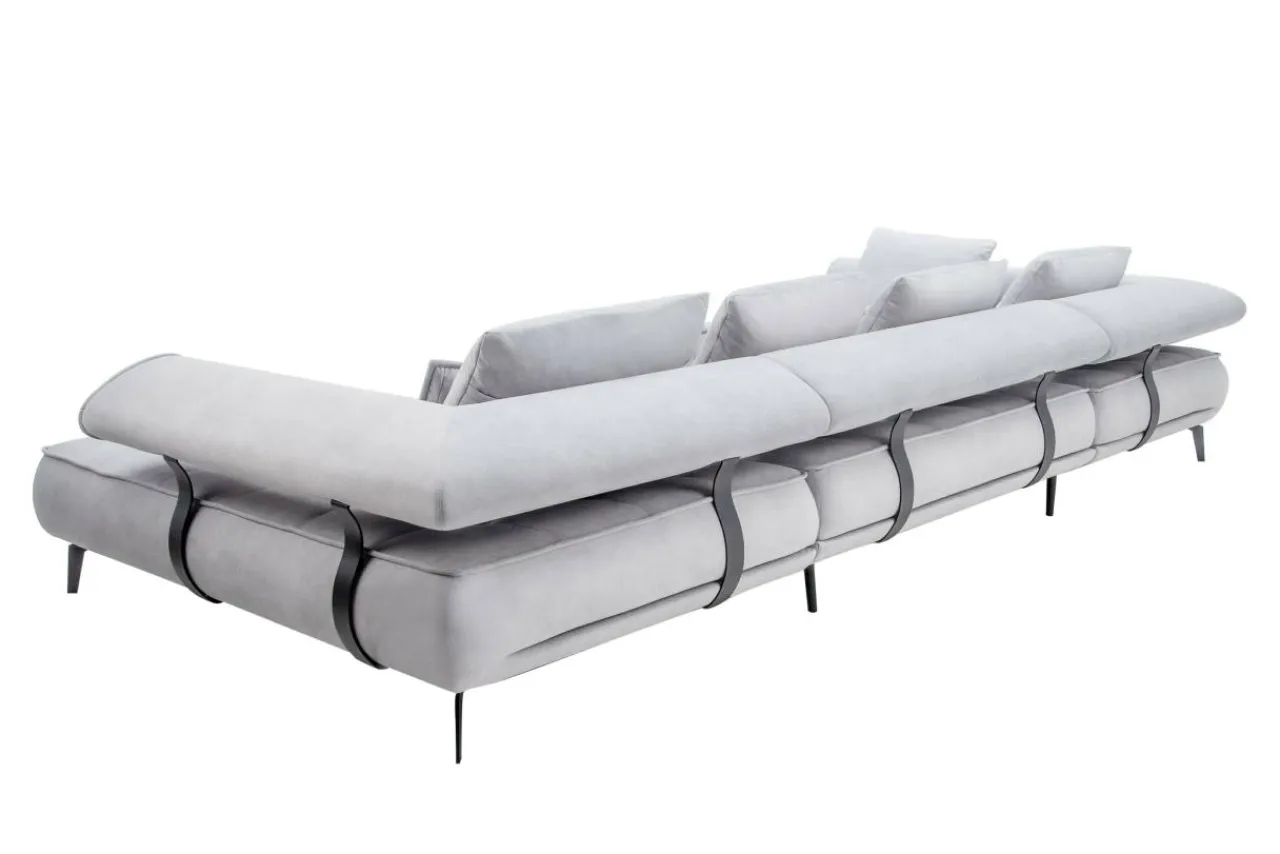 Narożnik w kształcie litery U postawiony jest na wysokich, lekko ukośnych nóżkach. Dzięki temu bryła, mimo pokaźnych rozmiarów, nabiera lekkości.