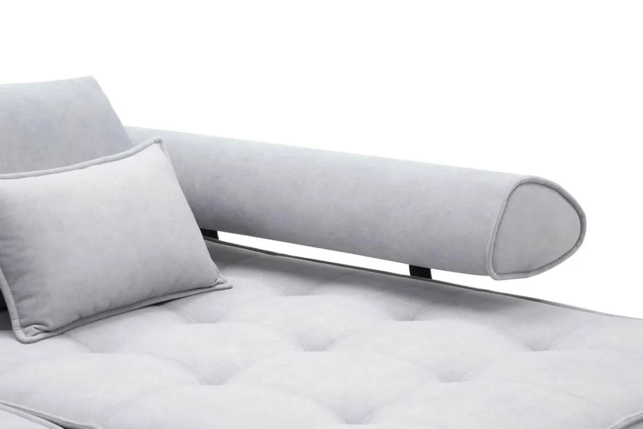 SELEDO XL jest utrzymany w chłodnej tonacji, którą podkreśla połączenie popielatej tapicerki w metalicznym odcieniu oraz czarnych, matowych nóżek i wsporników przy oparciu. Pikowane siedzisko i ozdobne szycie na poduszkach i podłokietnikach są delikatną ozdobą, która wzbogaca wygląd mebla.