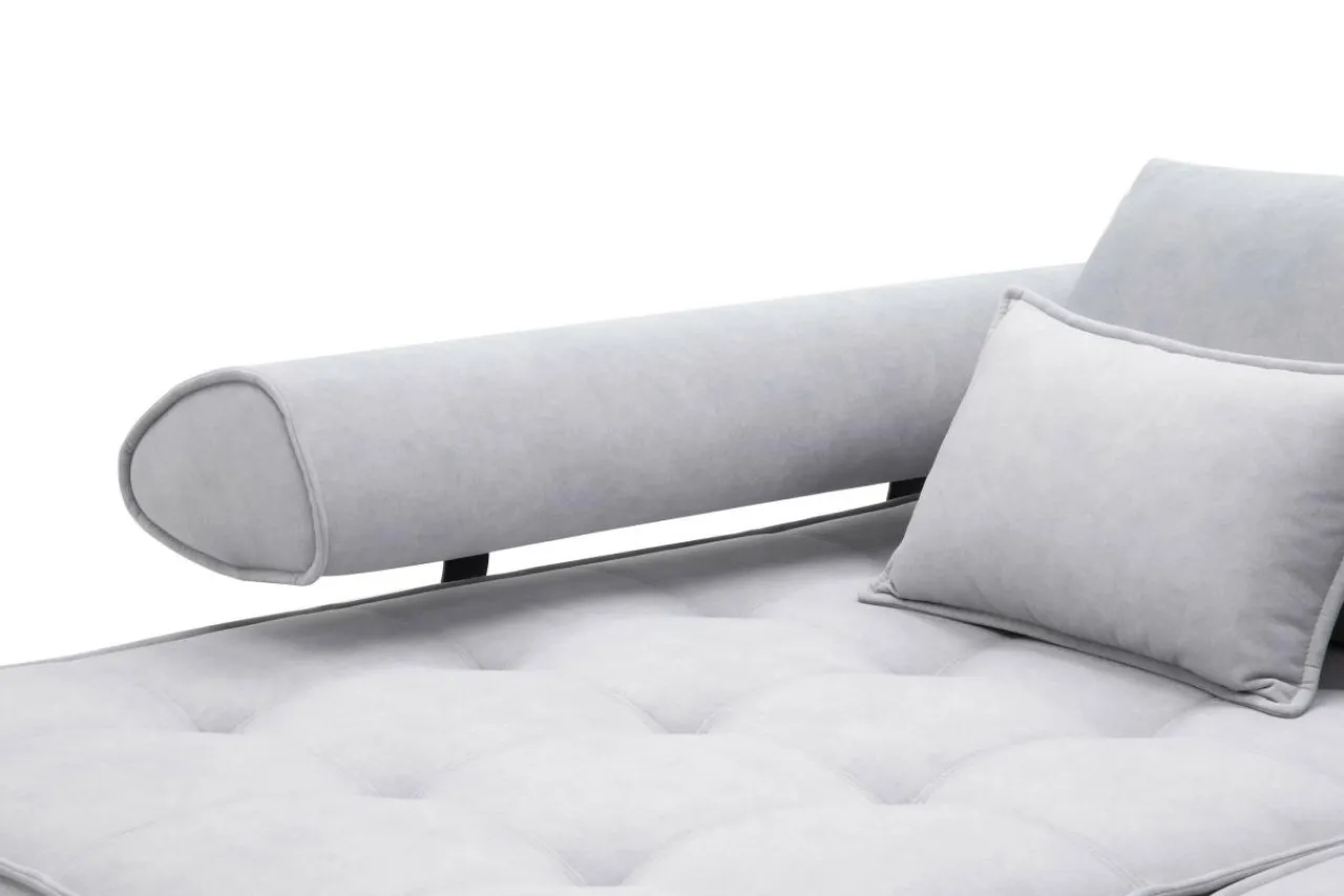 SELEDO XL jest utrzymany w chłodnej tonacji, którą podkreśla połączenie popielatej tapicerki w metalicznym odcieniu oraz czarnych, matowych nóżek i wsporników przy oparciu. Pikowane siedzisko i ozdobne szycie na poduszkach i podłokietnikach są delikatną ozdobą, która wzbogaca wygląd mebla.