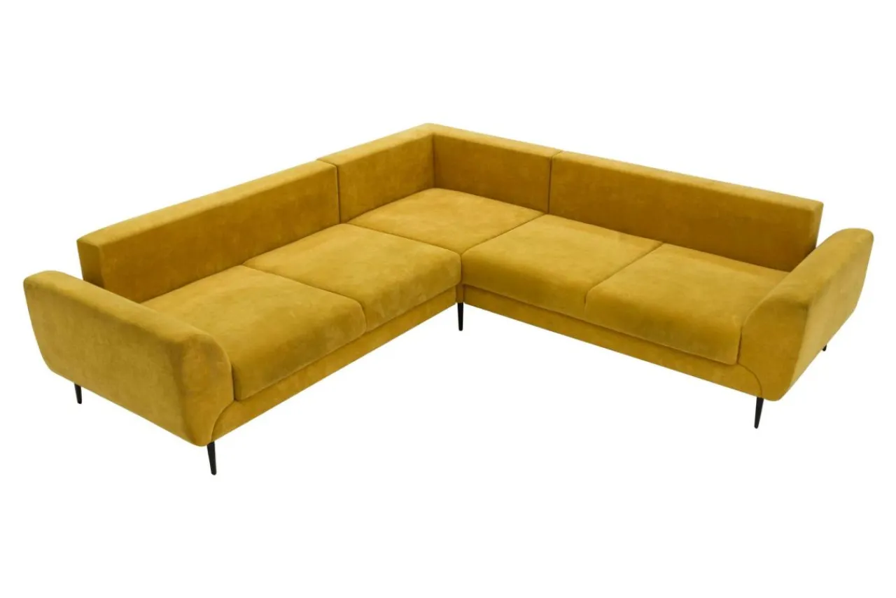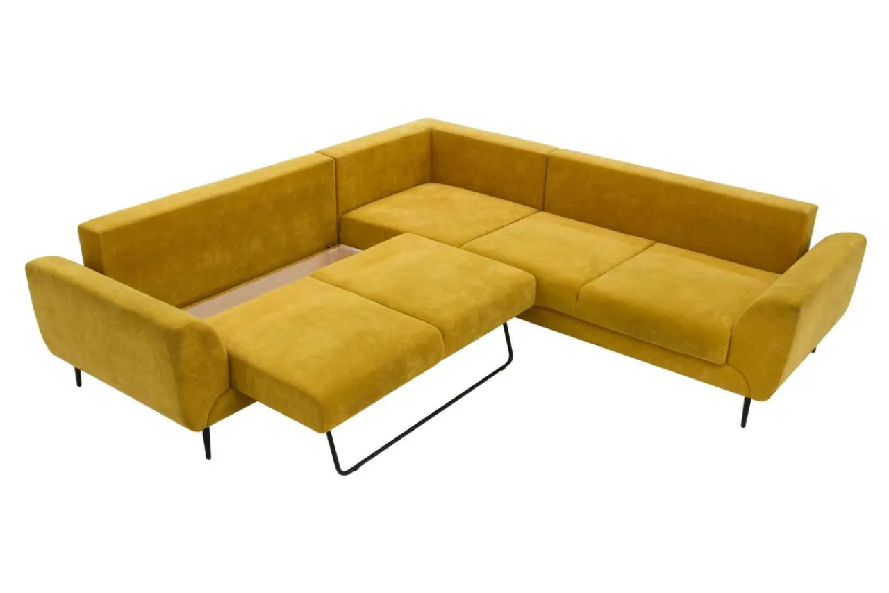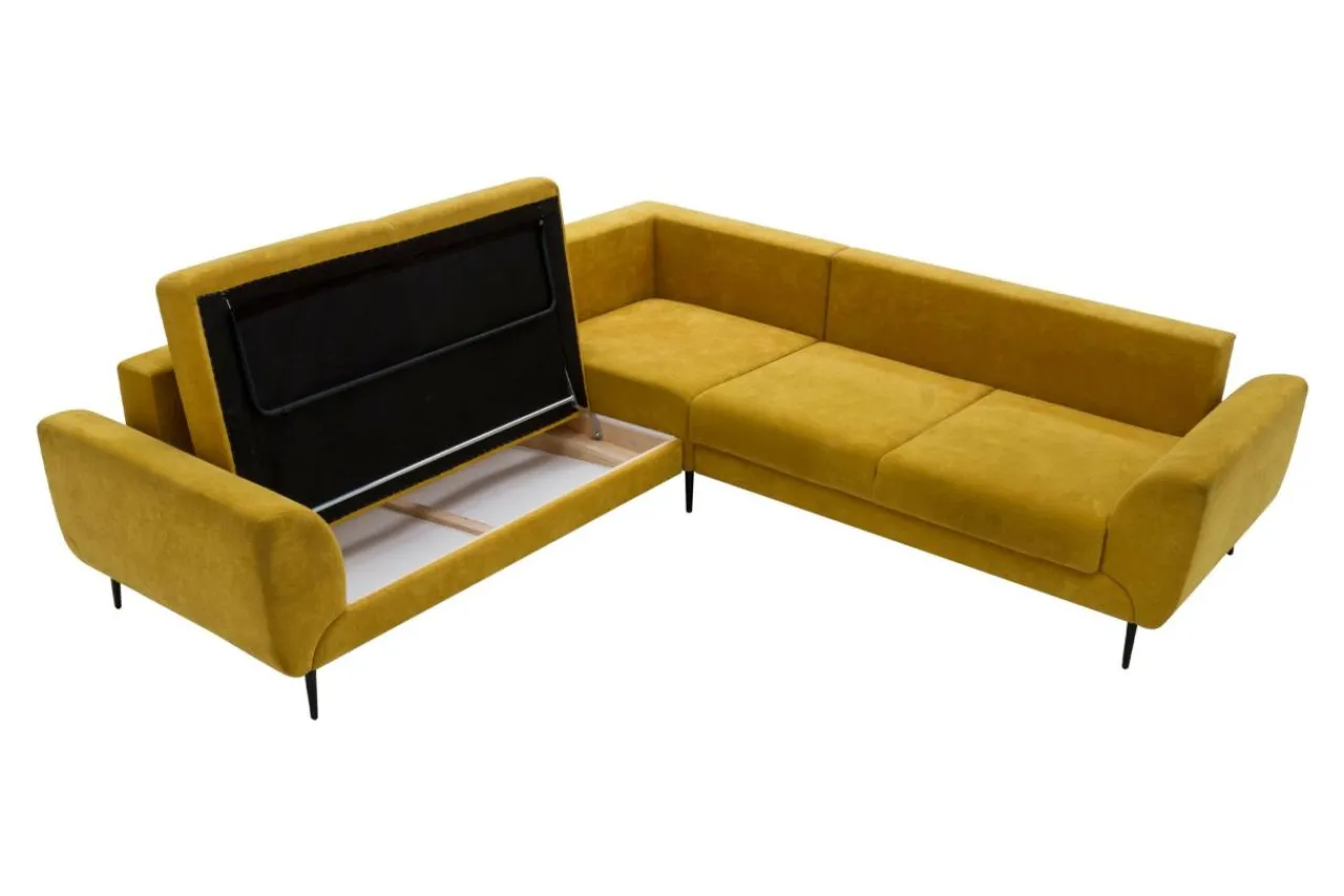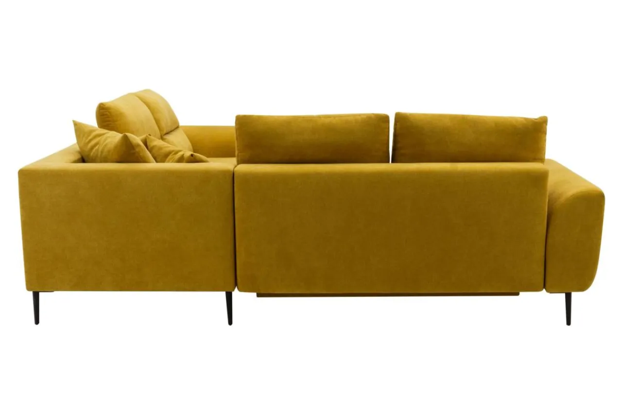 Mebel ustawiono na wysokich nóżkach w ciemnym kolorze, które ułatwiają sprzątanie pod meblem i tworzą kontrast z żywym kolorem tkaniny.
