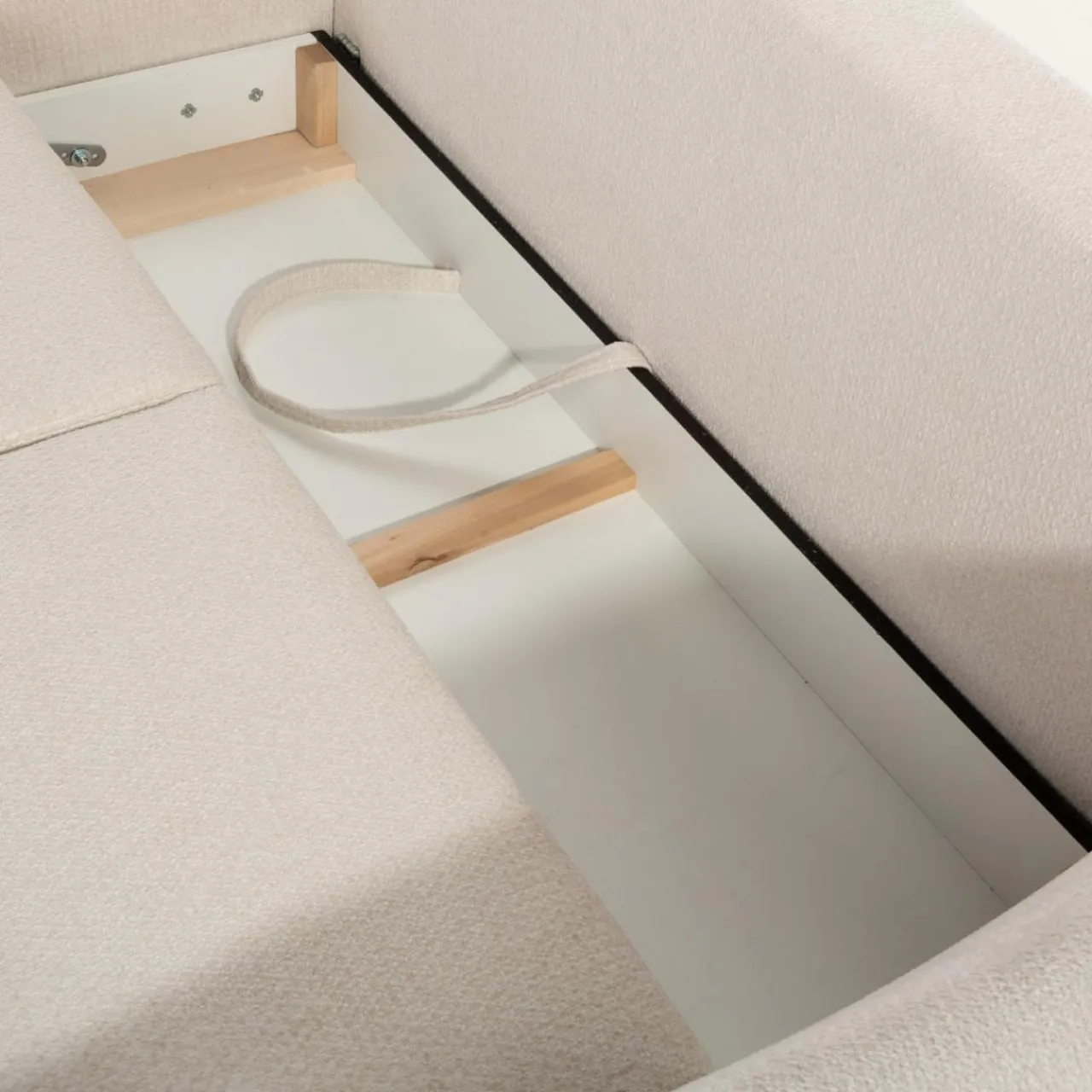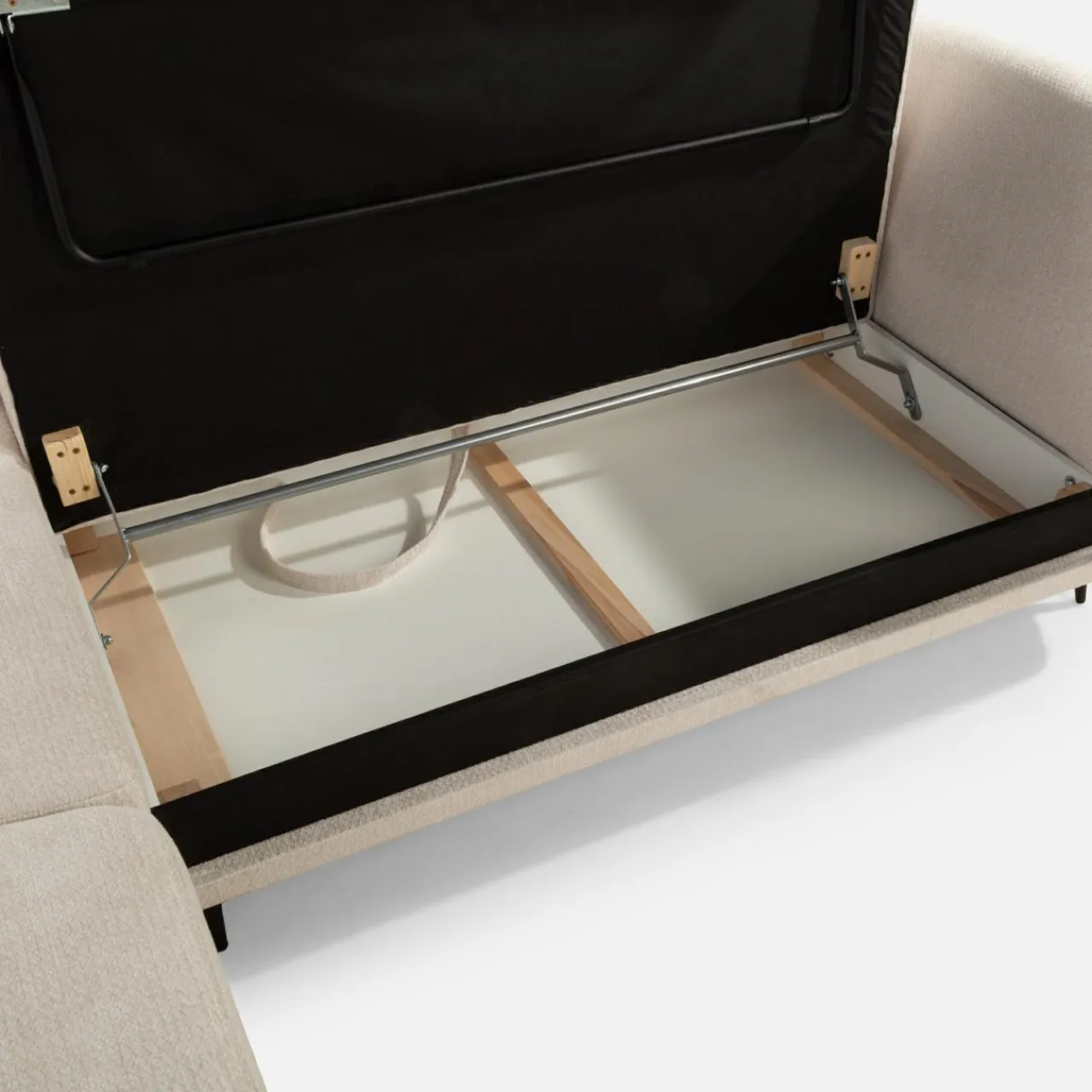 - Pojemnik pod siedziskiem to dodatkowa przestrzeń na pościel i inne domowe tekstylia. Dostęp do niego uzyskasz podczas rozkładania narożnika.