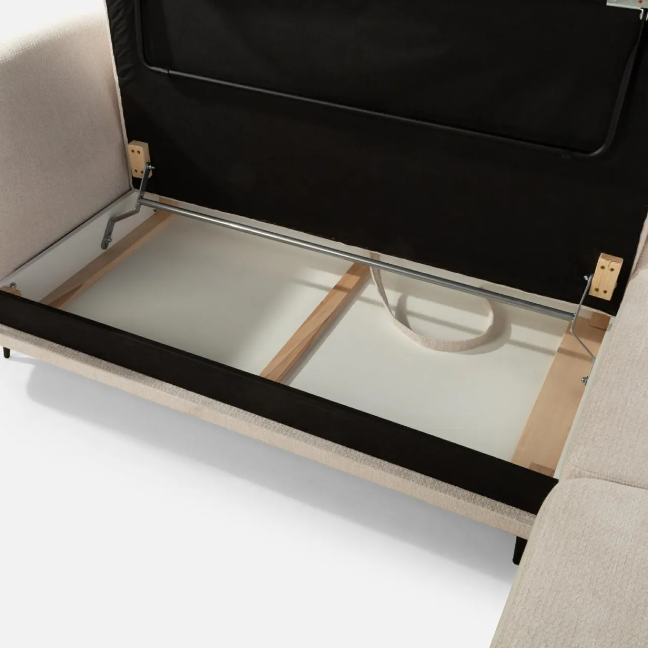 - Pojemnik pod siedziskiem to dodatkowa przestrzeń na pościel i inne domowe tekstylia. Dostęp do niego uzyskasz podczas rozkładania narożnika.
