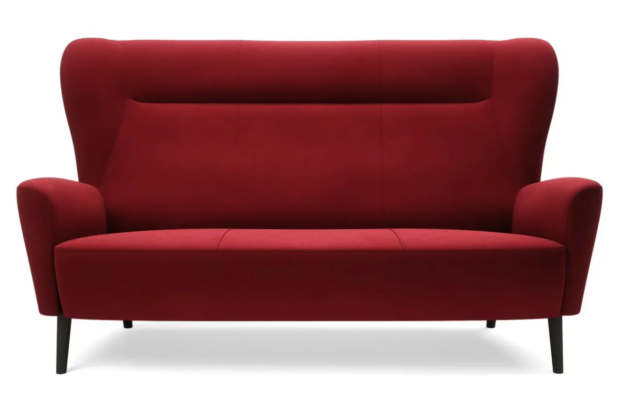 Odważny, ciemnoczerwony kolor, wysokie nóżki i kształt nawiązujący do fotela „uszaka” czynią sofę dekoracyjnym meblem, który będzie główną ozdobą salonu.