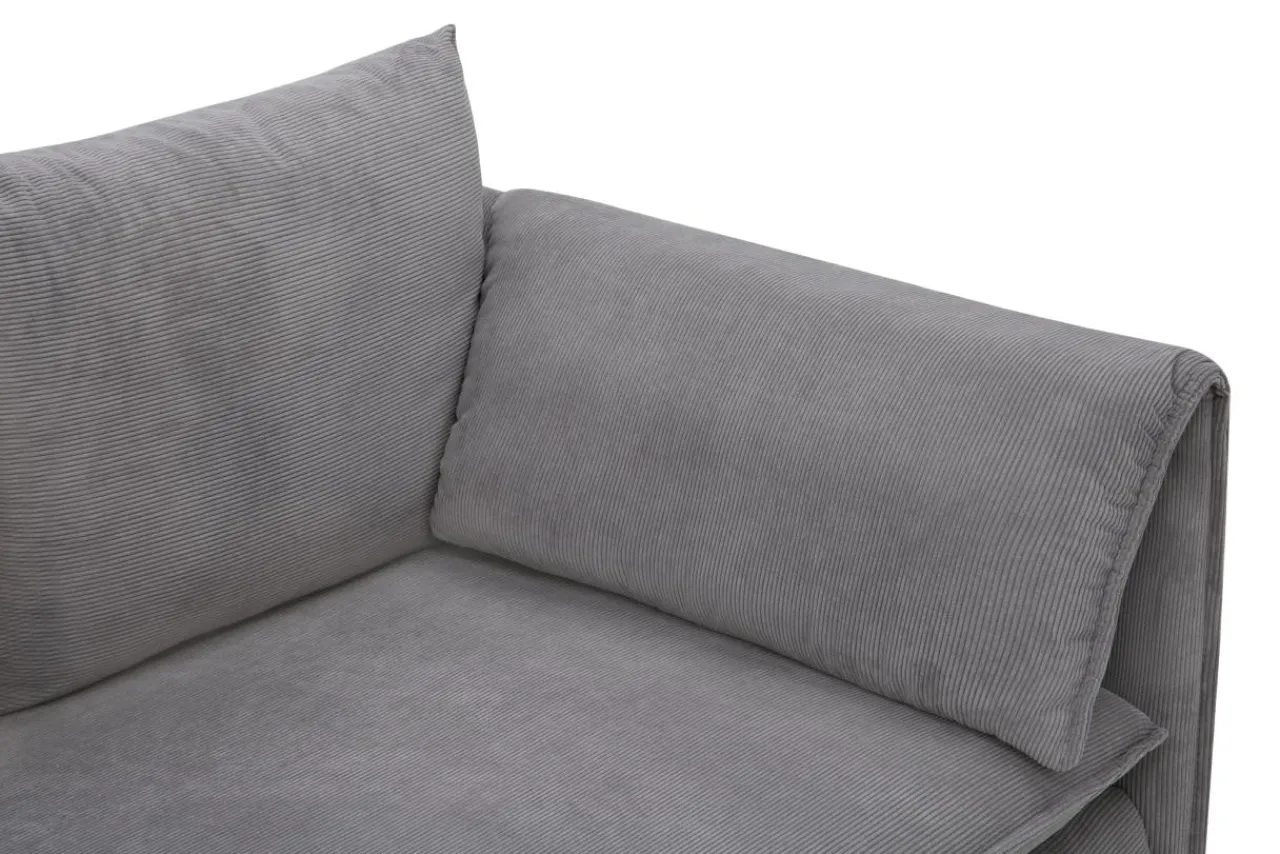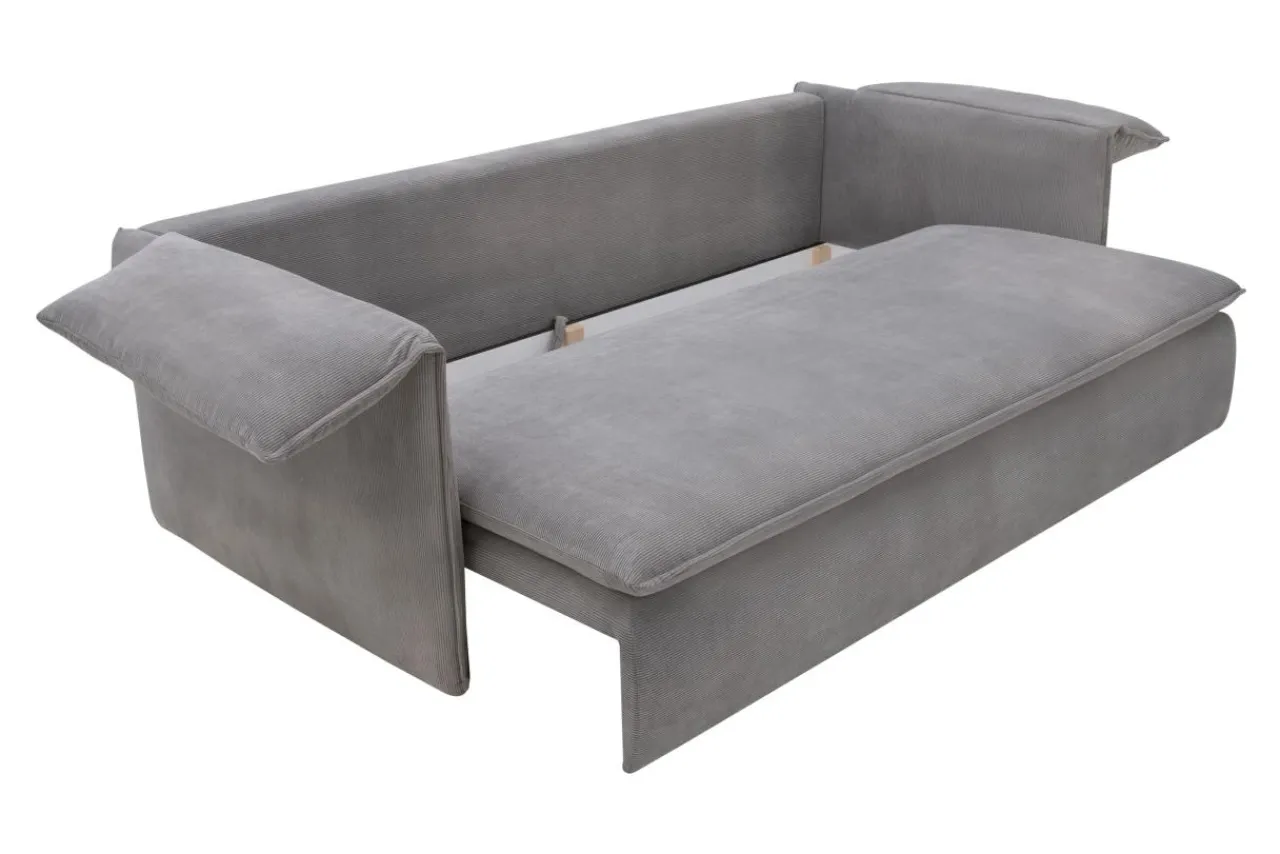Przyciąga wzrok szarą, sztruksową tapicerką, ale przede wszystkim ruchomymi podłokietnikami w formie poduszek.