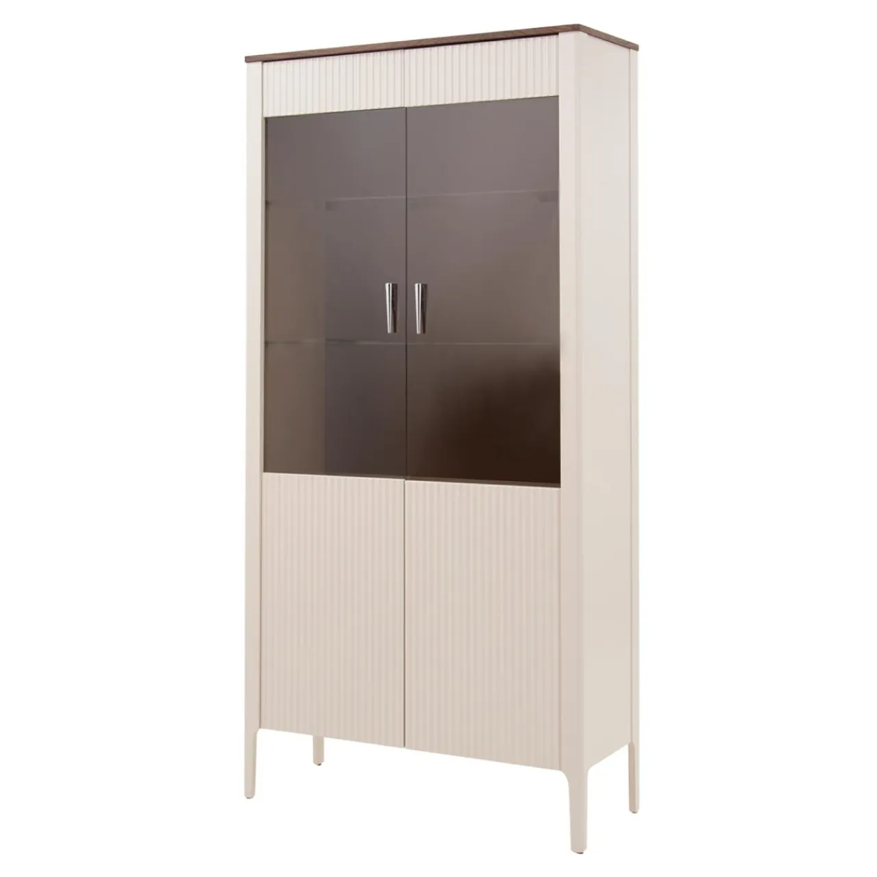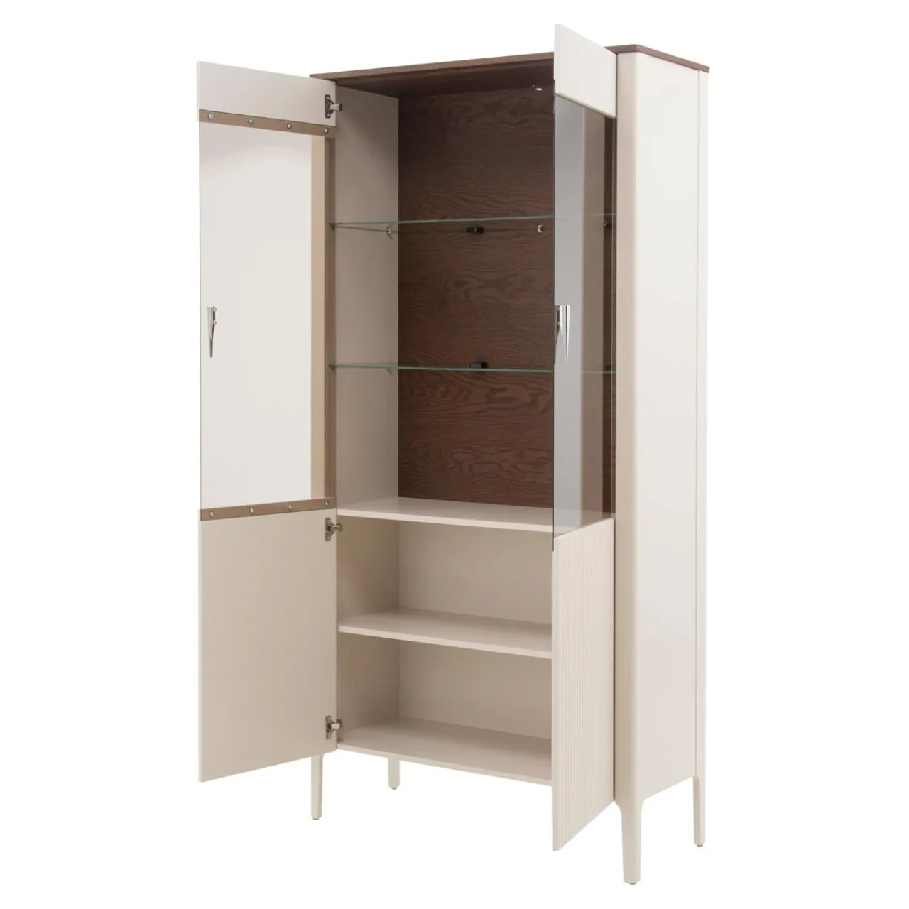 Jasny korpus witryny pięknie współgra z ciemnym blatem oraz brązowymi plecami witryny.