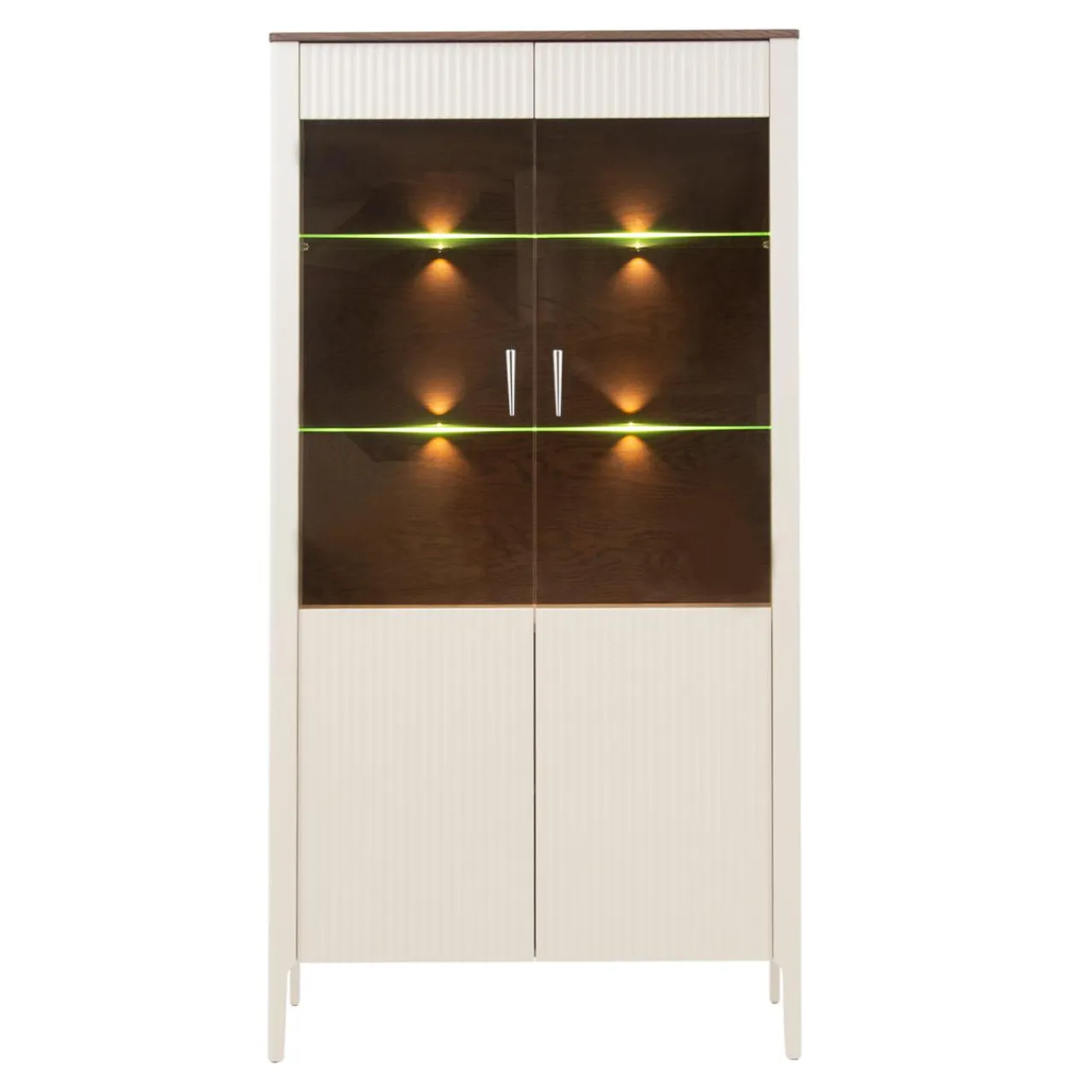 - Witryna posiada wmontowane oświetlenie typu Led dojo slim, które oświetla półki równocześnie od góry i dołu. W połączeniu z przeszklonym, barwionym na brązowo frontem osiągniesz efekt przytulnego, intymnego nastroju.