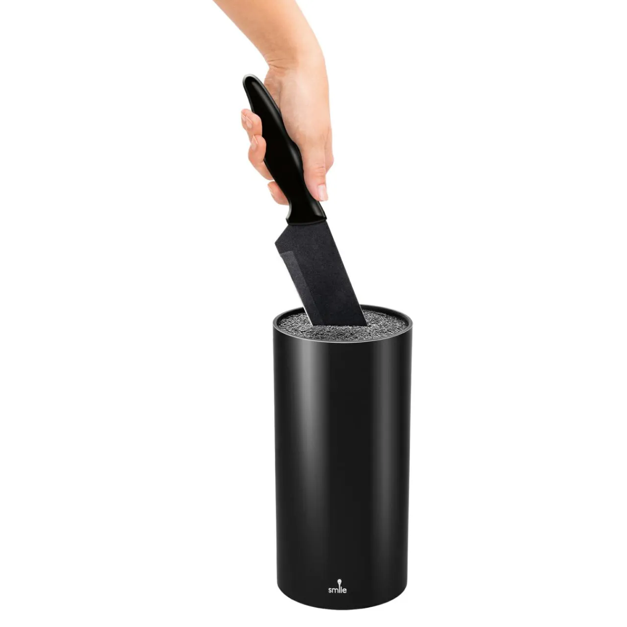 Designerski zestaw 5 stalowych noży w bloku, z wyjmowanym wkładem wykonanym z plastikowych pręcików. Noże posiadają precyzyjnie wyprofilowane ostrza z wysokiej jakości stali nierdzewnej pokrytej powłoką nieprzywierającą oraz uchwyty z antypoślizgową powłoką typu soft touch. Uniwersalny blok przystosowany jest do dowolnych noży, zarówno stalowych jak i ceramicznych.
