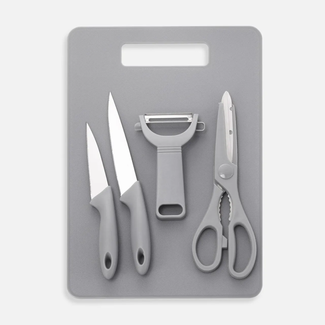 Funkcjonalny zestaw do krojenia składający się z 5 elementów, to niemal niezbędne wyposażenie każdej kuchni. Zestaw zawiera dwa noże, nożyczki kuchenne, obieraczkę oraz praktyczną deskę do krojenia. Wykonany z trwałych materiałów, takich jak stal nierdzewna oraz PP, zapewnia długotrwałe i wygodne użytkowanie.