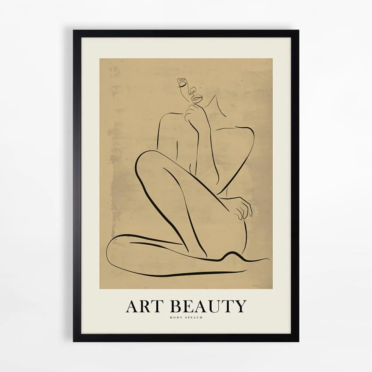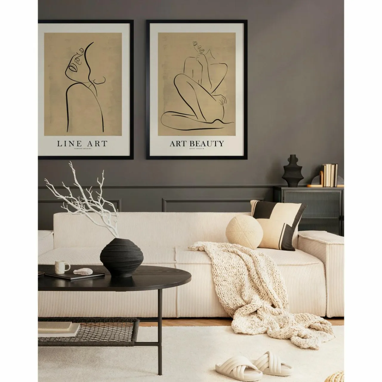 - Łagodne odcienie beżu i brązu zgrabnie korespondują z ciemną kreską i czarną ramą – to nieskomplikowane rozwiązanie sprawia, że obraz ART BEAUTY I jest widoczny z każdego miejsca w pokoju.