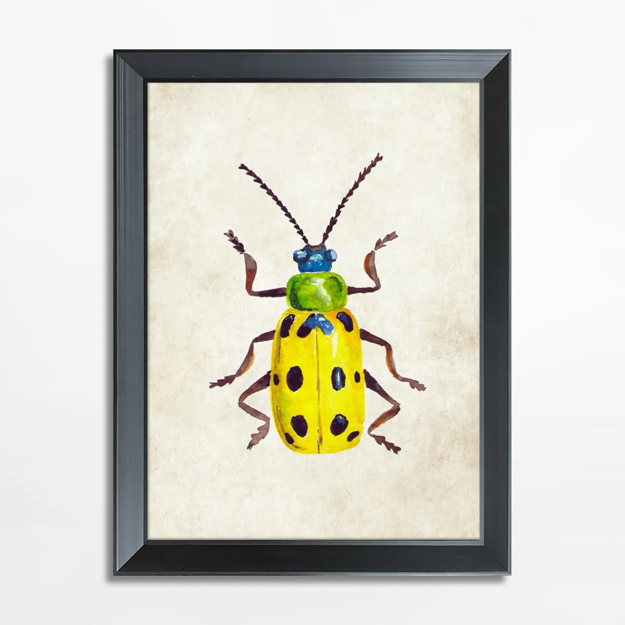 Obraz z kolekcji BEETLE w czarnej ramie z żółtym owadem udekoruje salon lub sypialnię.