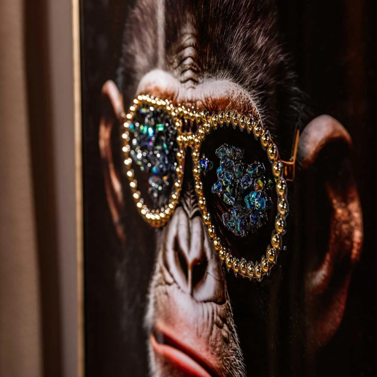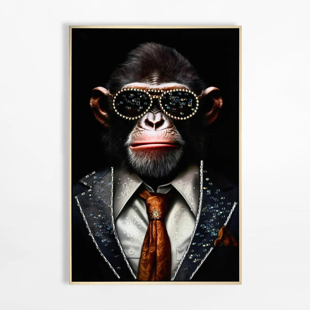 Obraz na płótnie z oryginalną grafiką małpy w eleganckim garniturze to niebanalny akcent – zdobiony akrylowymi elementami, delikatnie połyskuje, przyciągając wzrok.
