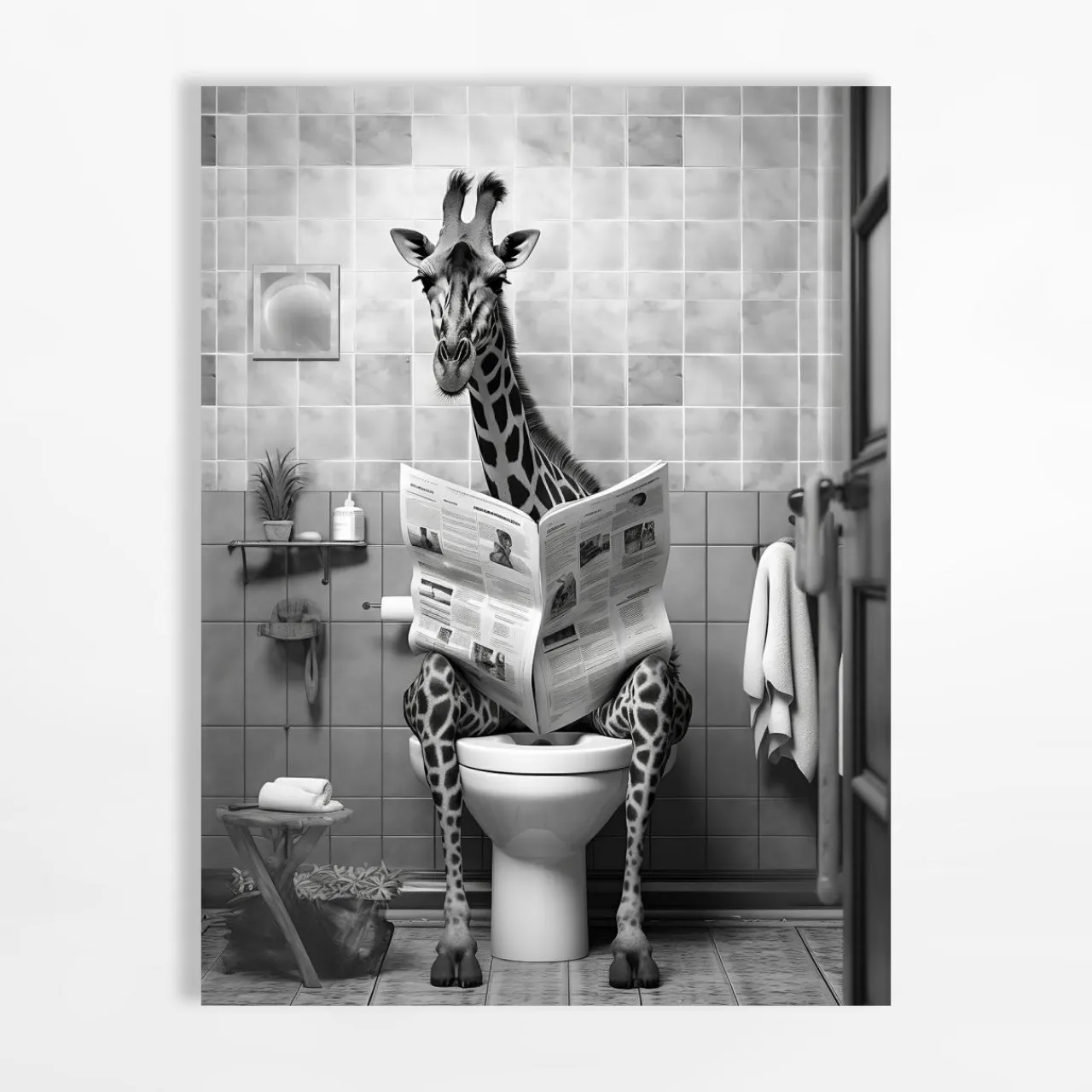 - Grafika z żyrafą czytającą gazetę na ubikacji rozbawi Ciebie i Twoich gości.
