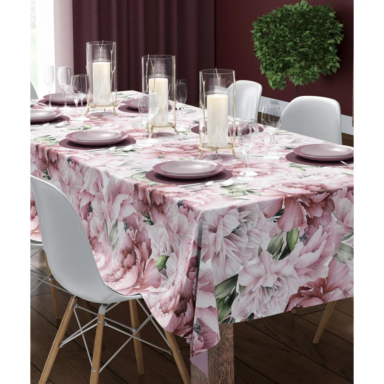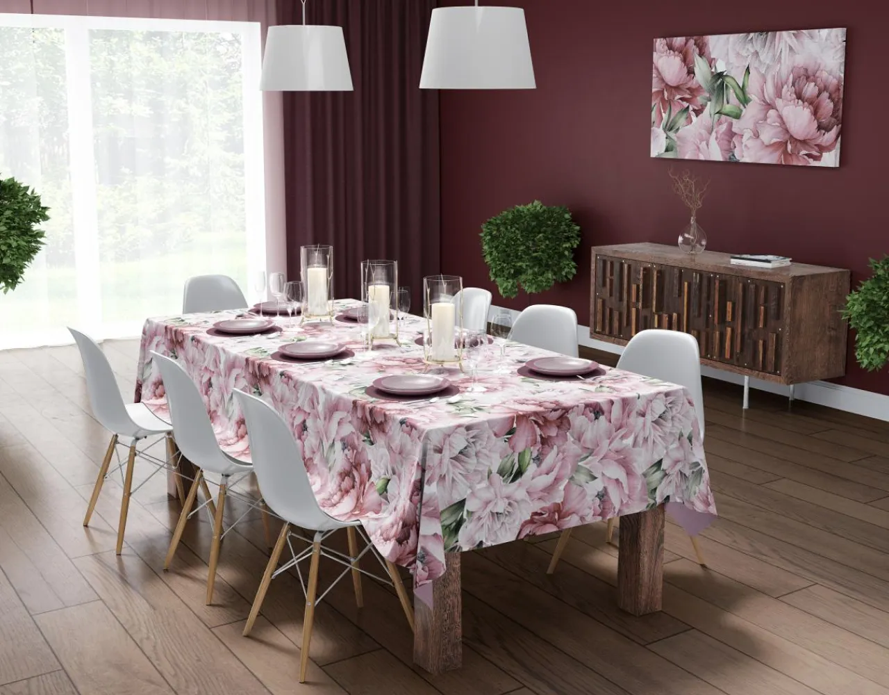 Wybierz obrus który jest wykonany jest z tkaniny z poliestru oraz bawełny. Obrus zdobi wzór różowych kwiatów.
