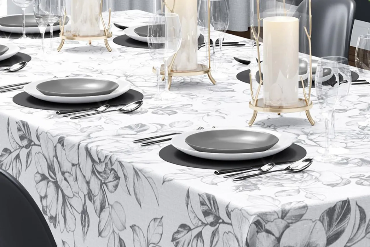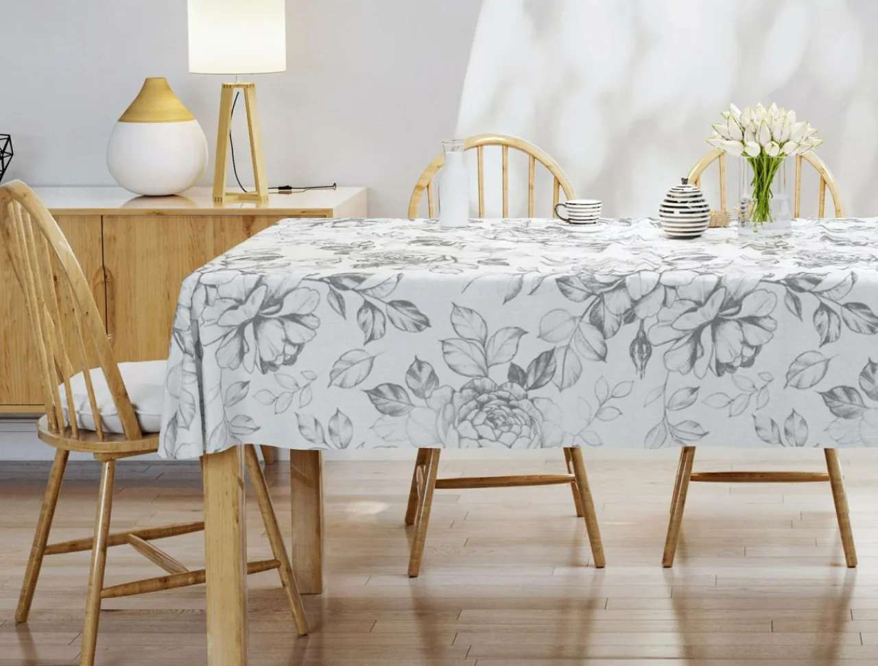Lubisz roślinne akcenty? Obrus w szare kwiaty subtelnie udekoruje niedzielny stół w jadalni. Twoja porcelanowa zastawa będzie na nim pięknie wyglądać.