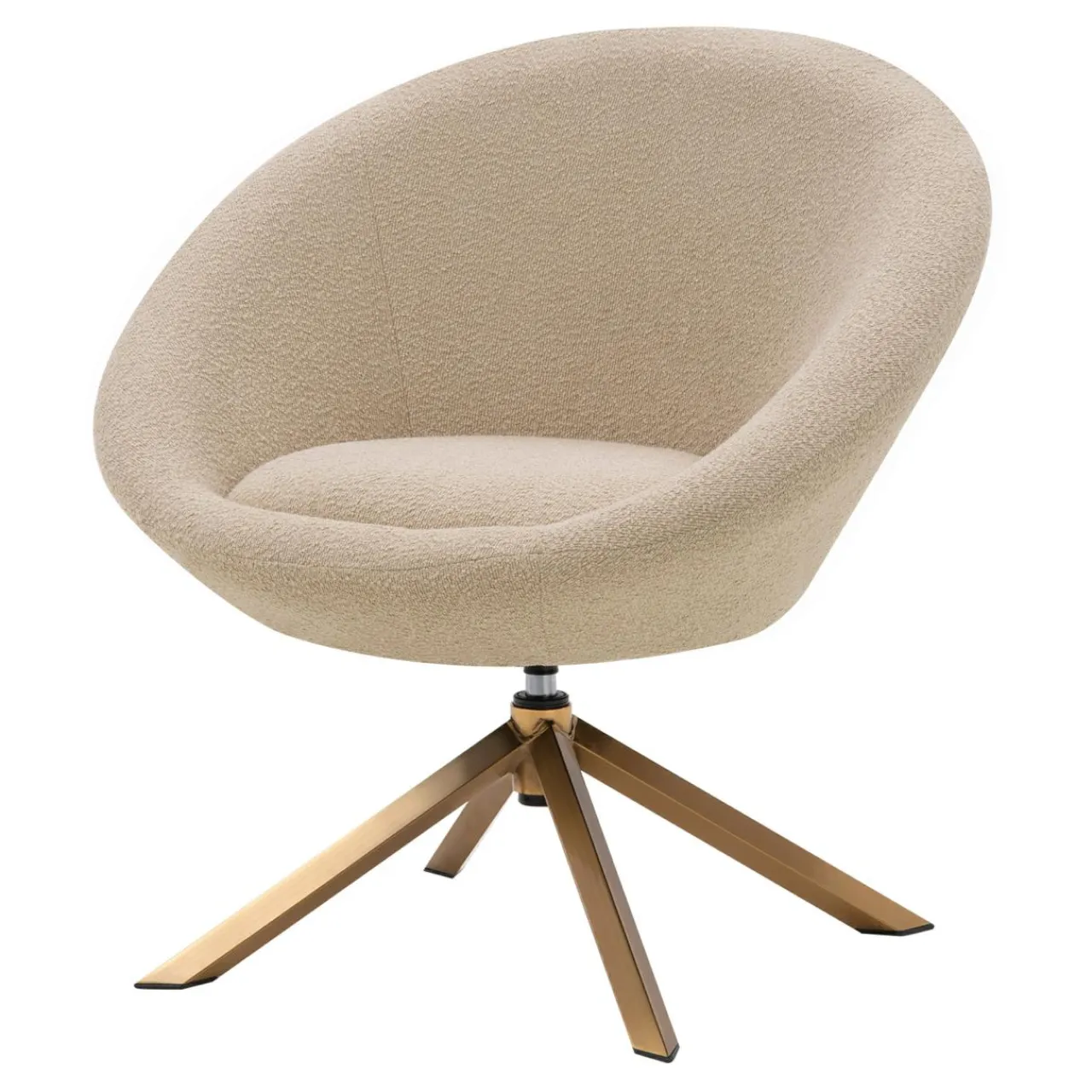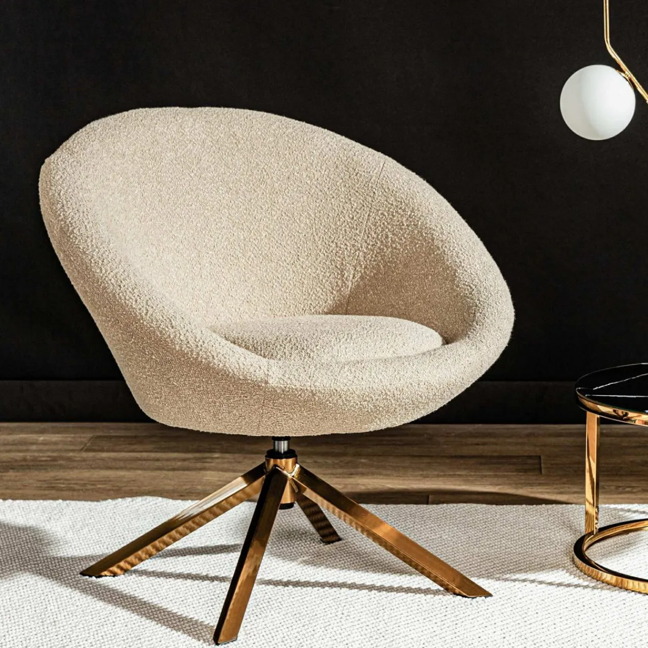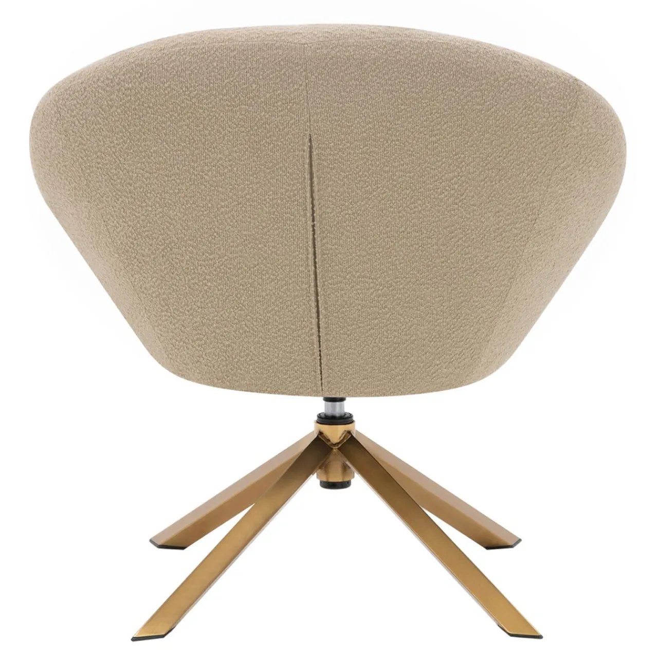 - Fotel pokryto tkaniną o wyrazistej strukturze – przypominającą nieco boucle. Wygląda intrygująco w połączeniu ze złotą podstawą.