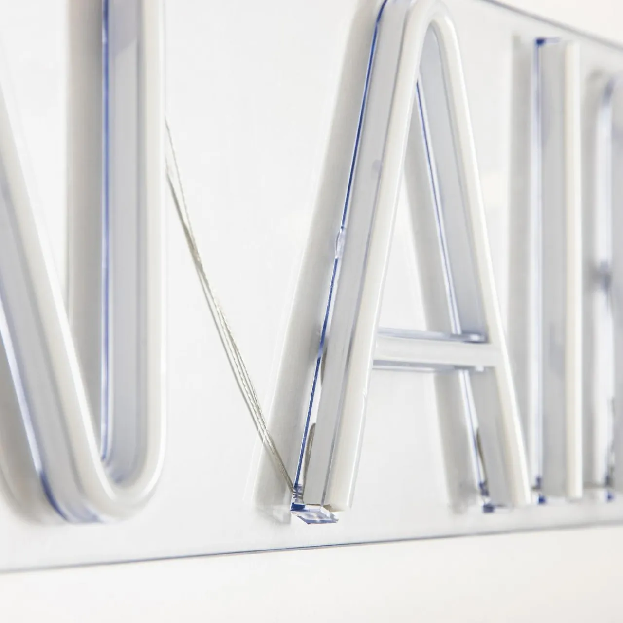 Kiedy NEON ON AIR jest zgaszona jest tylko biała ozdoba, natomiast zaświecona rozjaśni pokój intensywnym światłem w odcieniach błękitu i różu.