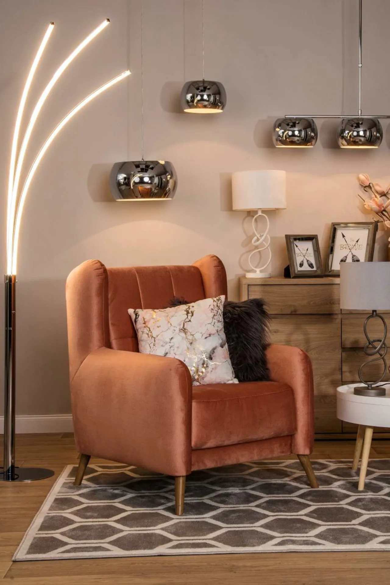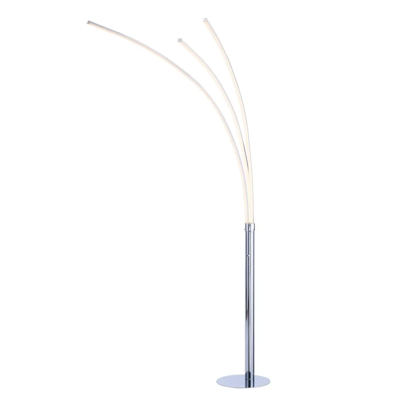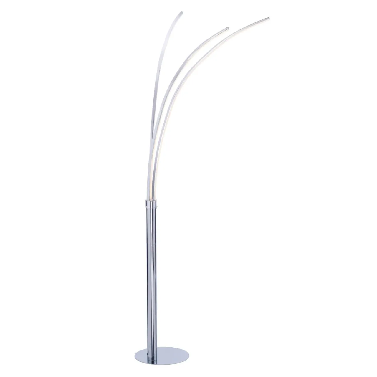 Metalowa podstawa lampy wykończona w kolorze chrom posiada trzy ramiona, z zintegrowanym oświetlenie typu LED. Każde z ramion emituje światło o ciepłej temperaturze barwowej 3000K. Strumień świetlny lampy wynosi 1320 lumenów.