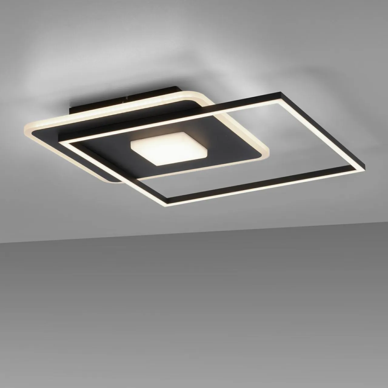 Geometryczny kształt tej lampy tworzy kwadratowa podstawa oraz okalająca ją ramka z wbudowanym oświetleniem LED.