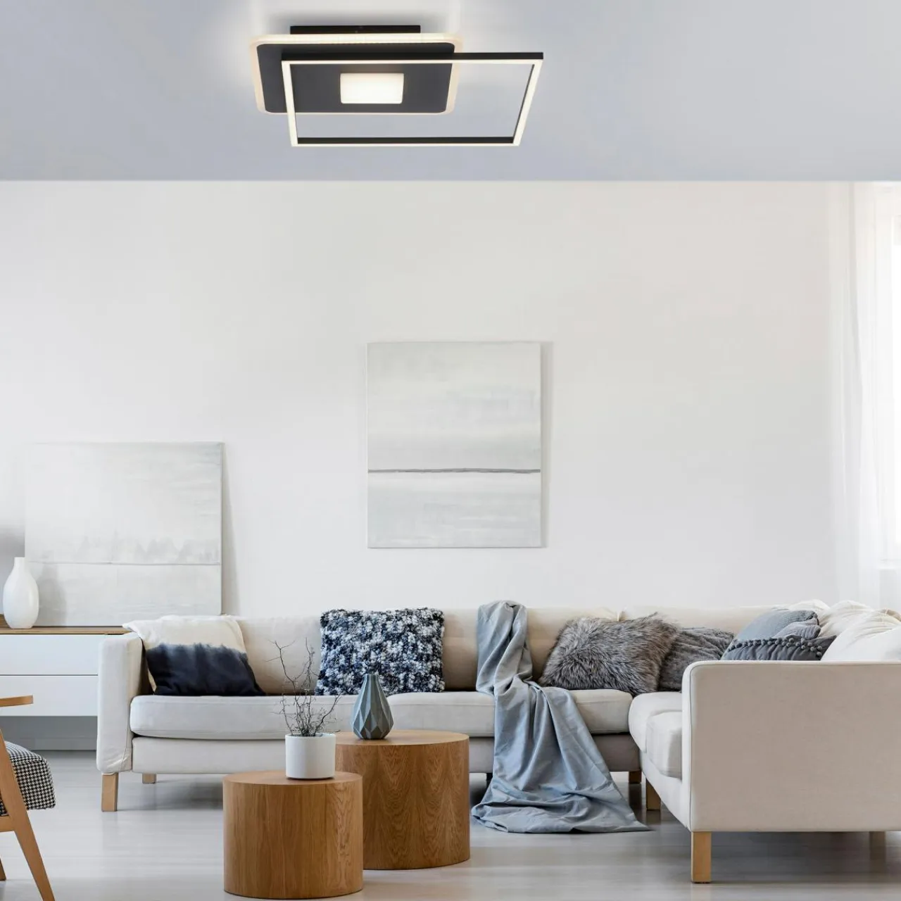 Urządź salon w nowoczesnym stylu – wybierz lampę sufitową DOMINO o okrągłej lub kwadratowej oprawie.