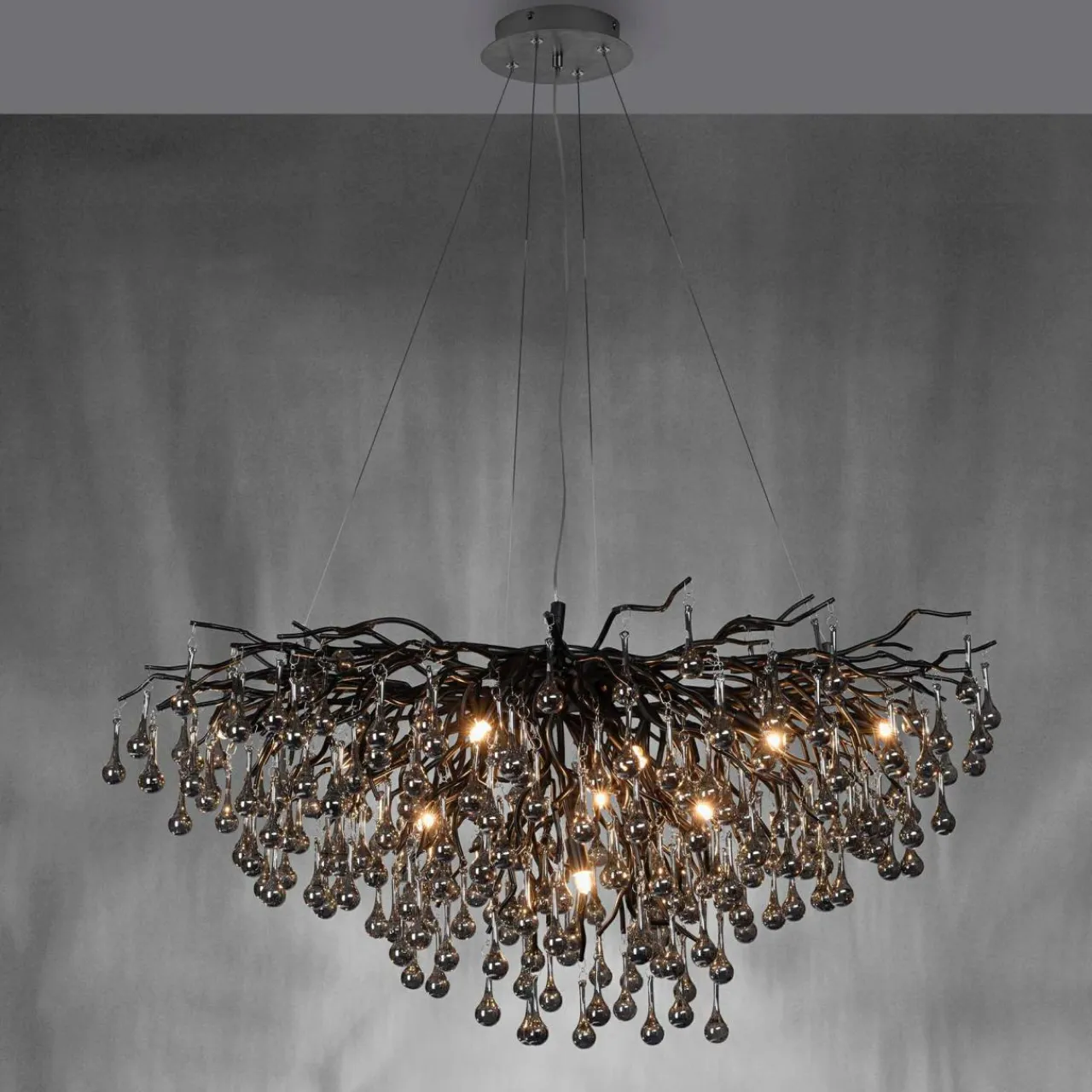 - ICICLE ma szerokość 100 i głębokość 50 cm, dlatego doskonale sprawdzi się w dużych, przestronnych wnętrzach. Konstrukcję zdobią, zwisające niczym sople lodu, kryształki ze szkła i akrylu.