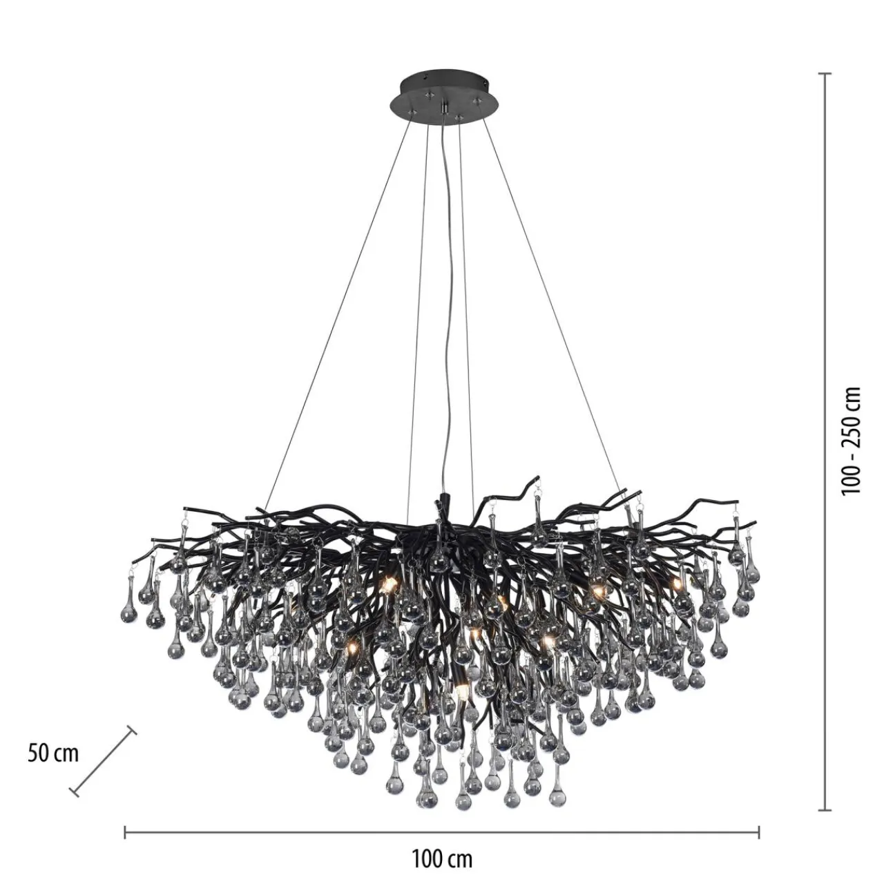 W tym modelu lampy wiszącej możesz dopasować wysokość zawieszenia w zakresie 100 – 250 cm.