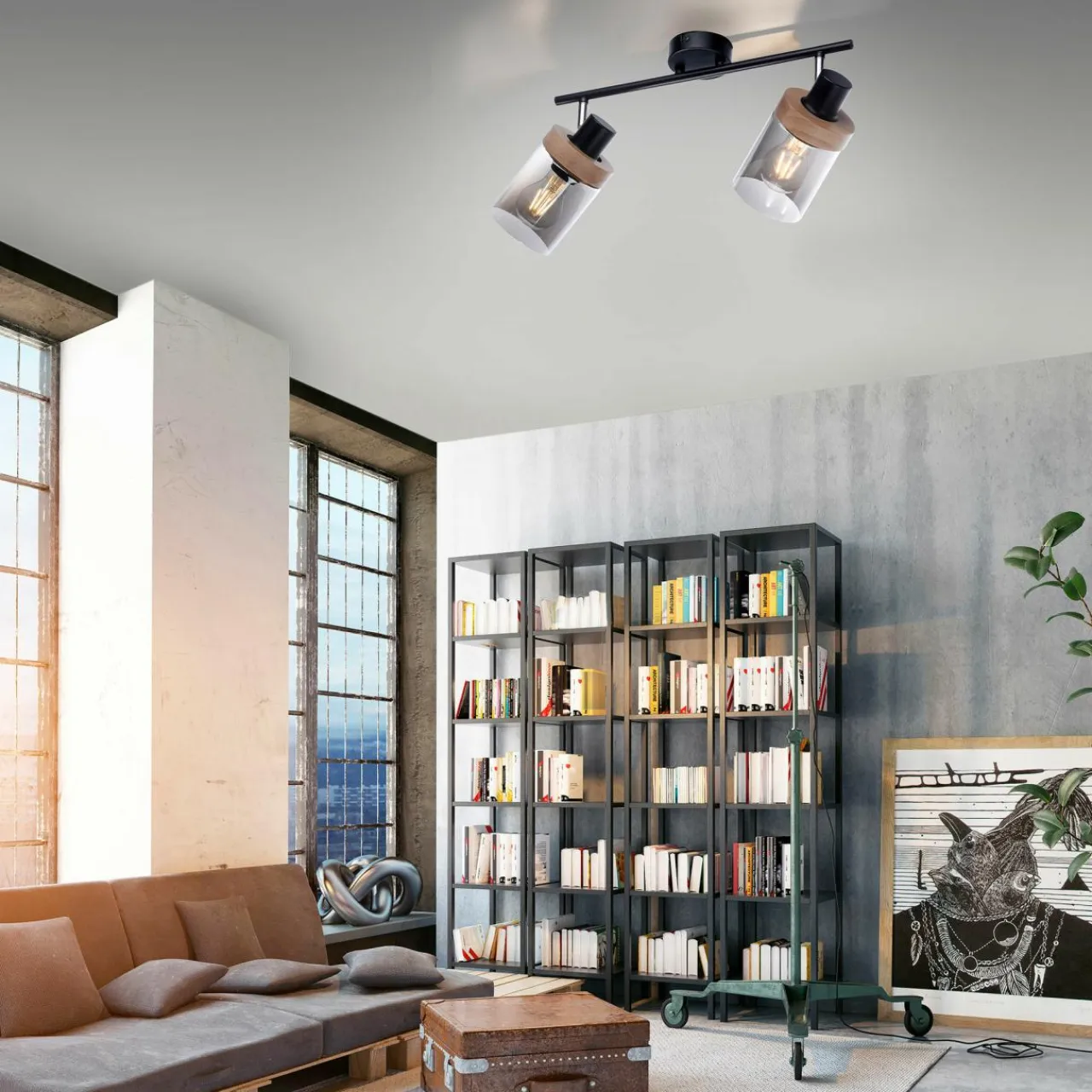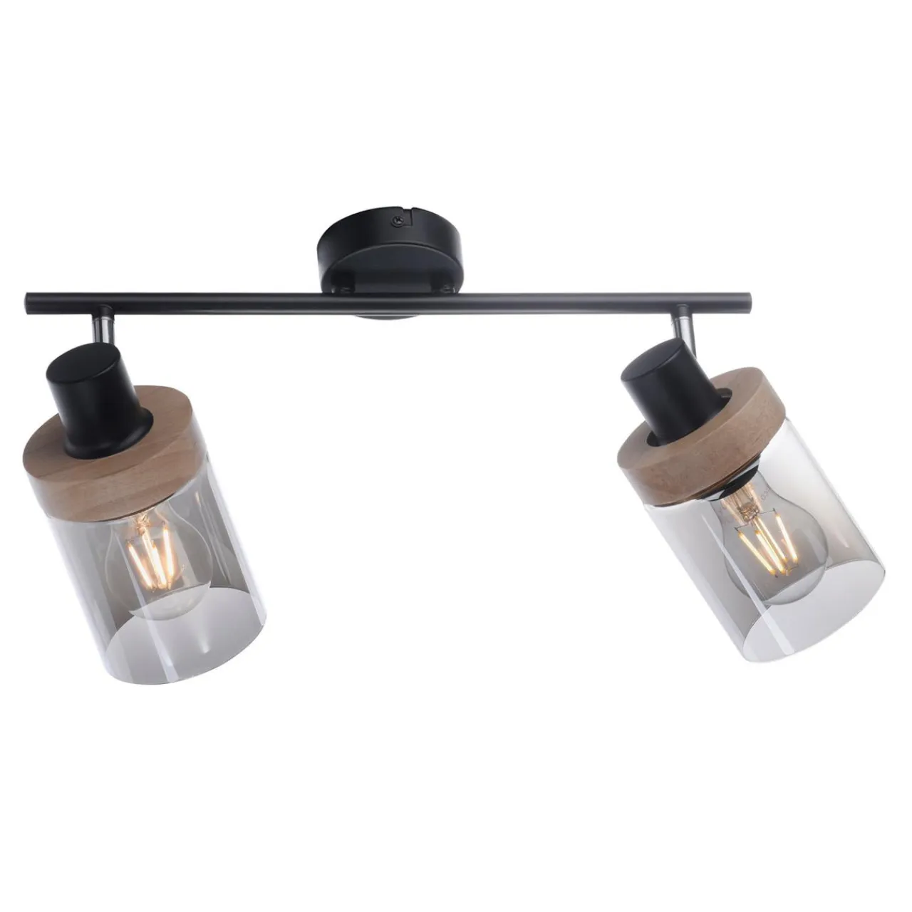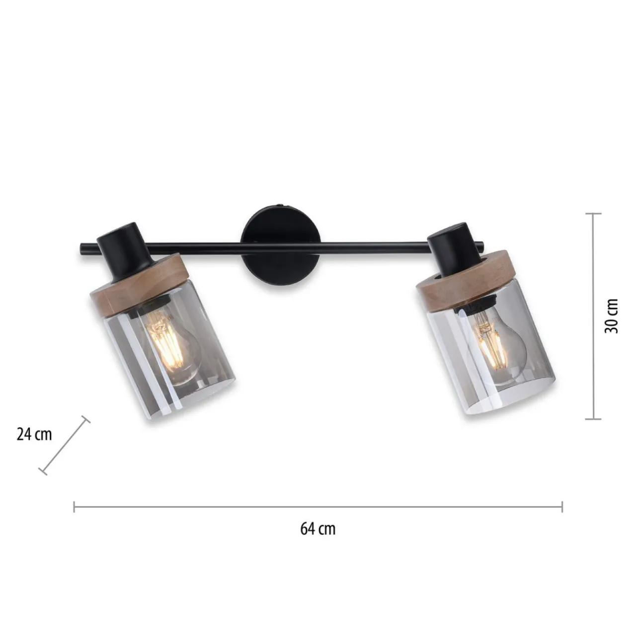 Lampa ma okrągłą, metalową podstawę, do której dołączona jest listwa z 2 ruchomymi kloszami. Każdy z nich został ozdobiony drewnianym wykończeniem. Żarówki zostały ukryte za transparentnym, lekko przydymionym szkłem.