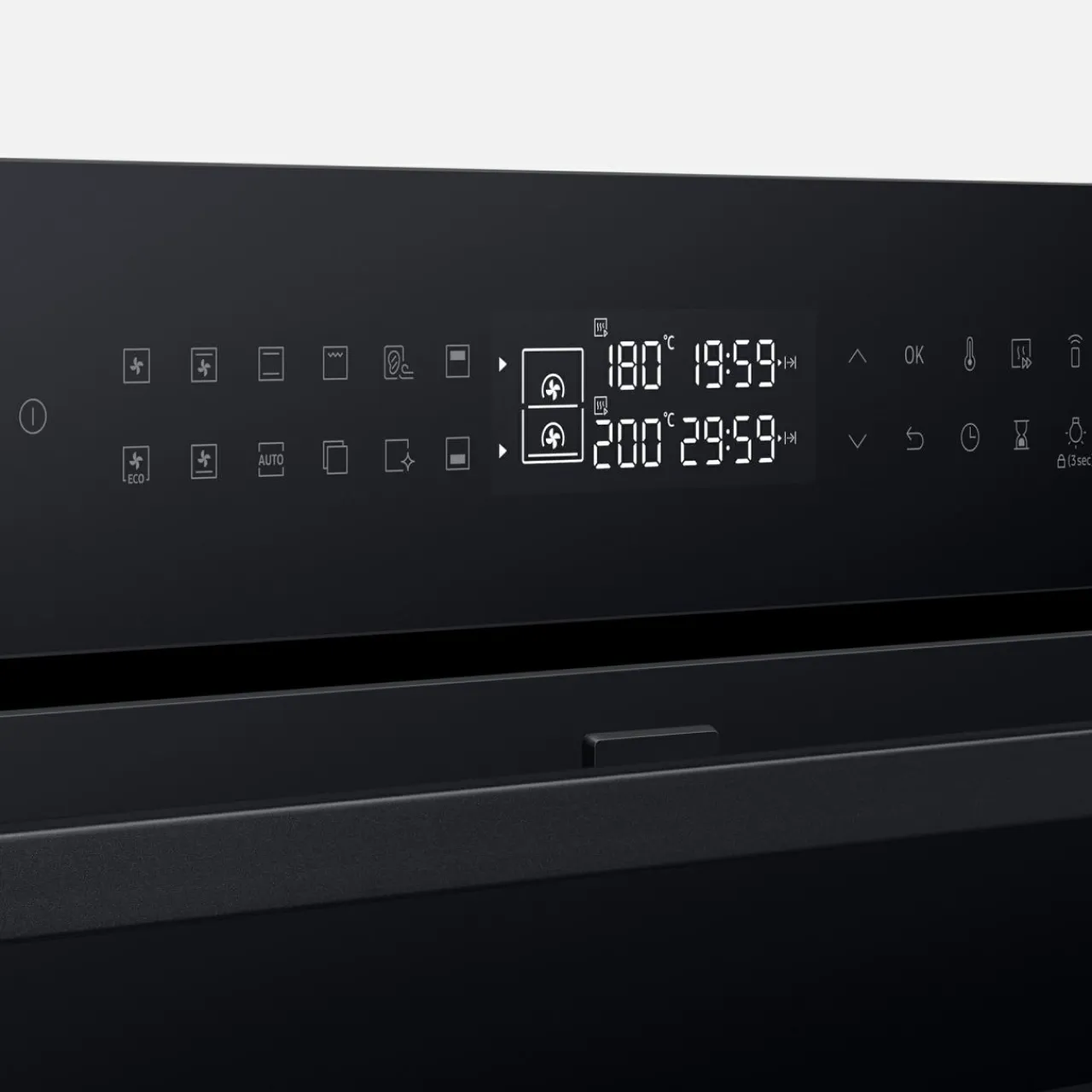 - Technologia Dual Cook – podział komory piekarnika na dwie niezależne strefy, umożliwiający jednoczesne pieczenie dwóch potraw bez mieszania zapachów.