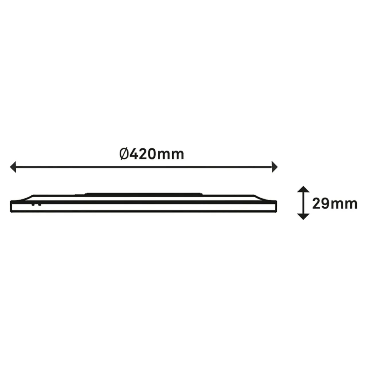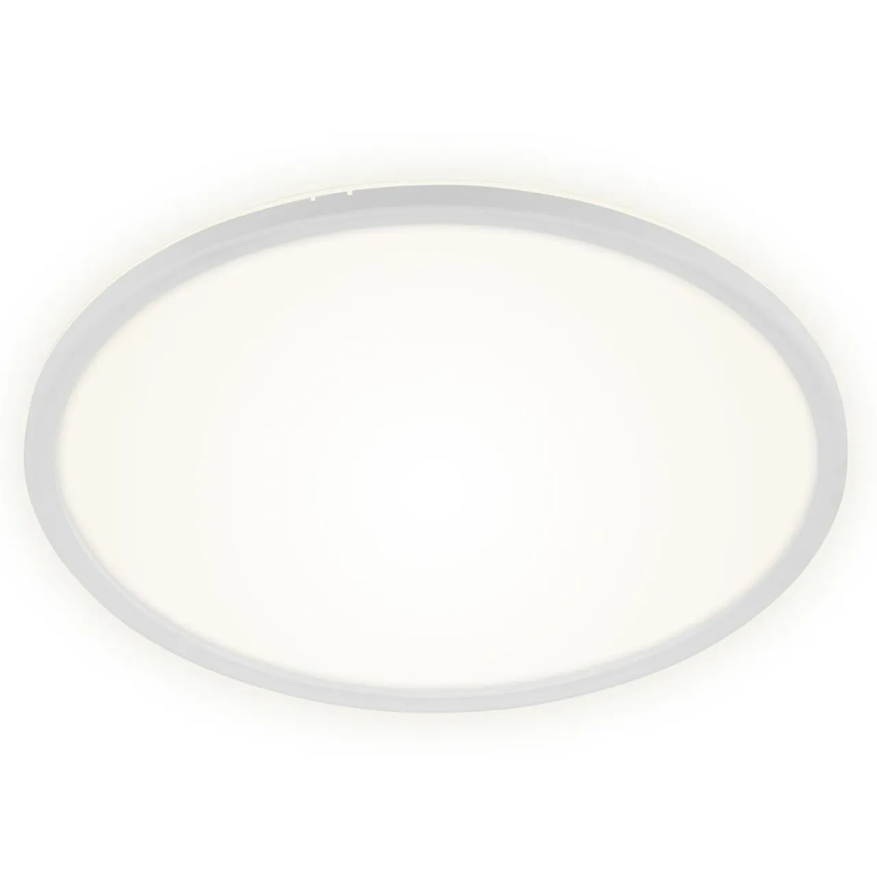 Okrągła podstawa lampy z białym obramowaniem jest cienka (ma jedynie 2,9 cm) i lekka, co pozwala zamontować lampę na podwieszanych sufitach.