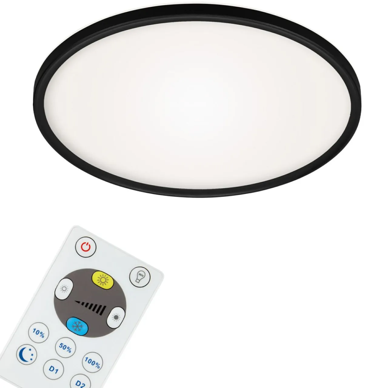 Okrągła podstawa lampy z czarnym obramowaniem jest cienka (ma jedynie 2,9 cm) i lekka, co pozwala zamontować lampę na podwieszanych sufitach.