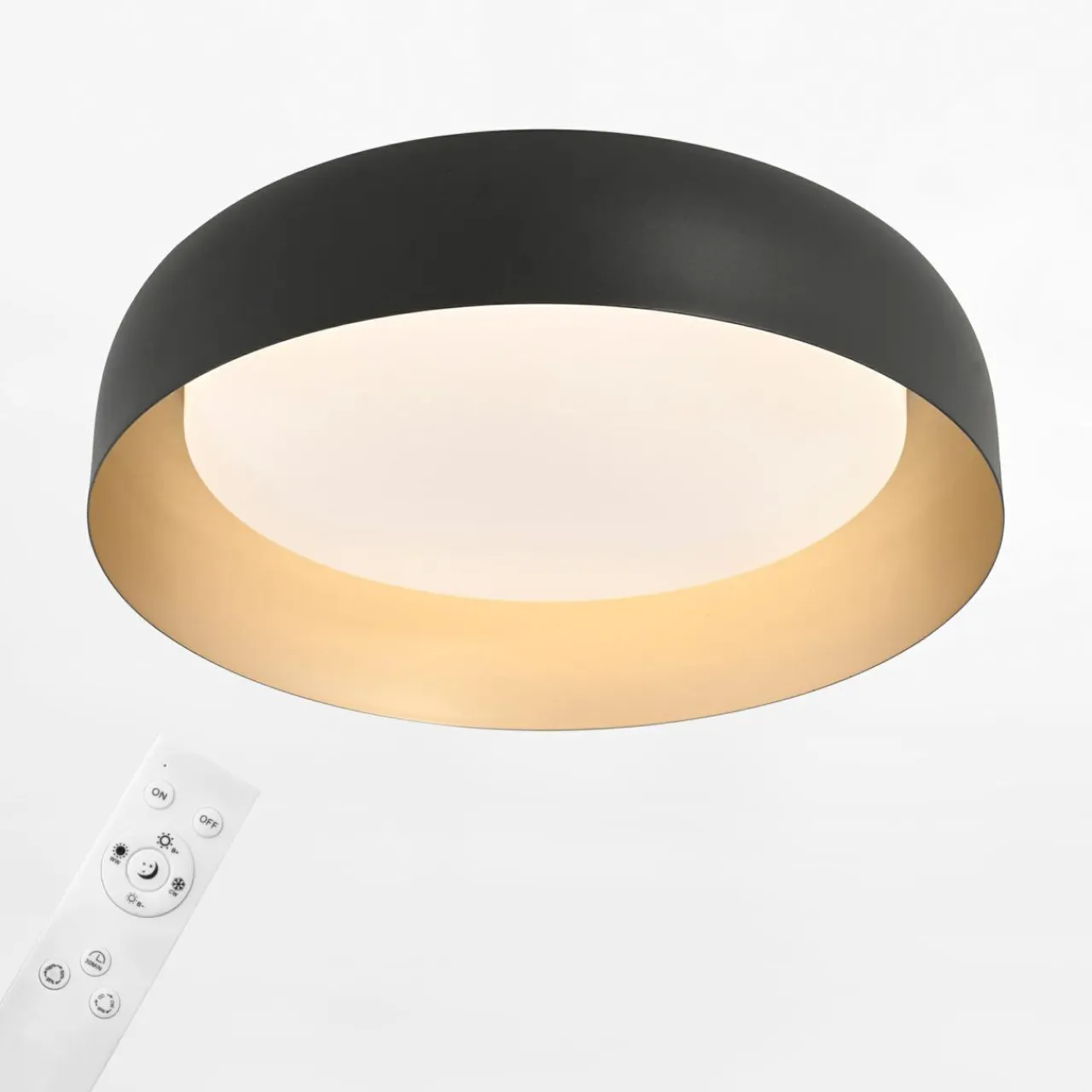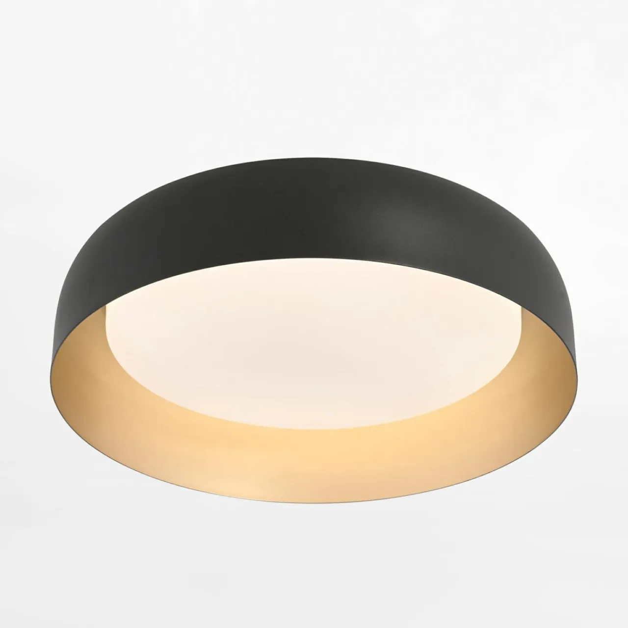 Czarne wykończenie klosza oraz jego złote wnętrze sprawi, że z łatwością dopasujesz plafon do estetyki opartej na w szarościach i bielach.