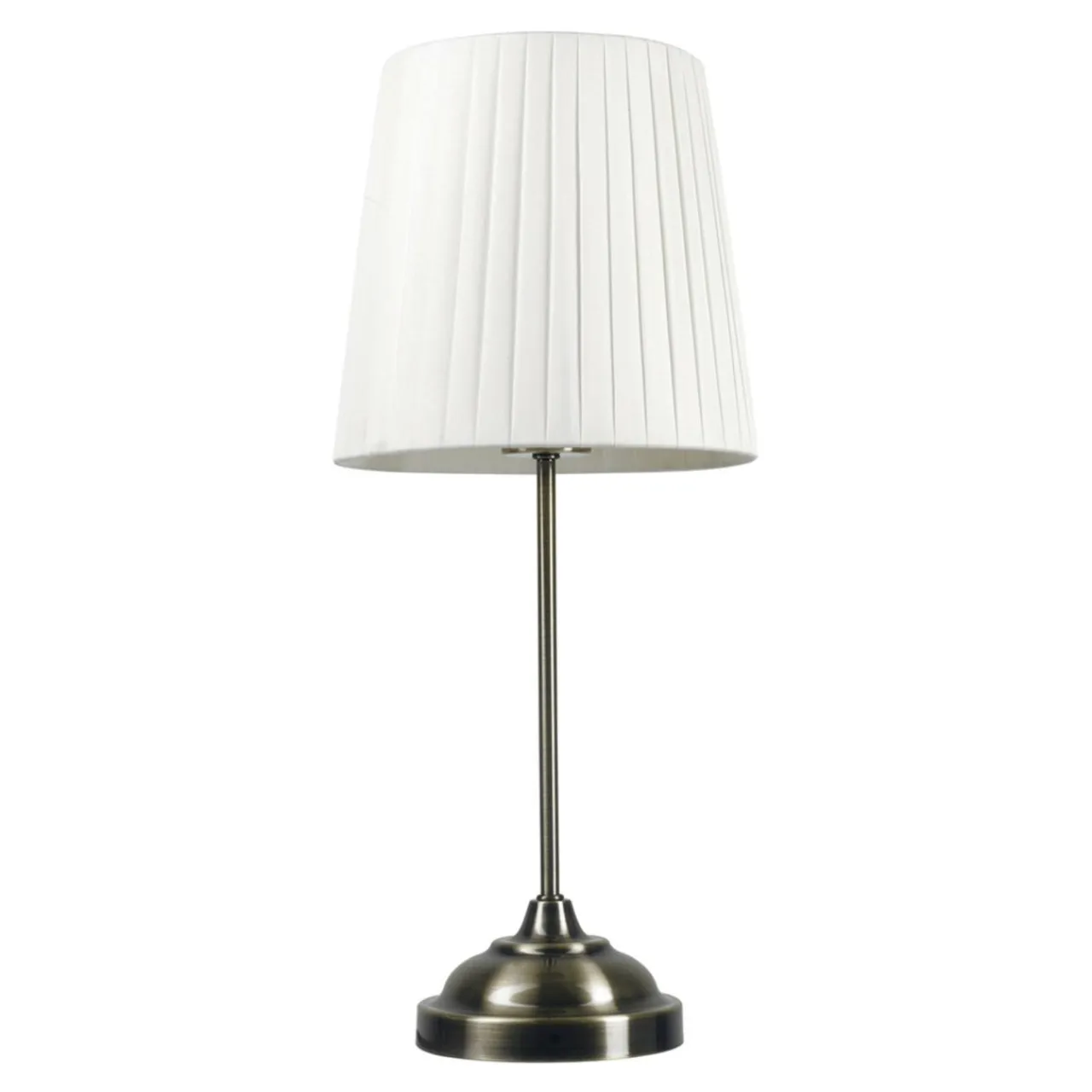 Niniejszy model lampy stołowej ma metalową podstawę o wykończeniu w kolorze brązu z lekkim połyskiem. Jej kształt wzorowany jest na ozdobnych lampach z lat 20-tych XX wieku. Kształt podstawy współgra z trapezowym abażurem wykończonym białą tkaniną. Dodatkowym atutem są zdobienia na jego powierzchni przypominające falbany.